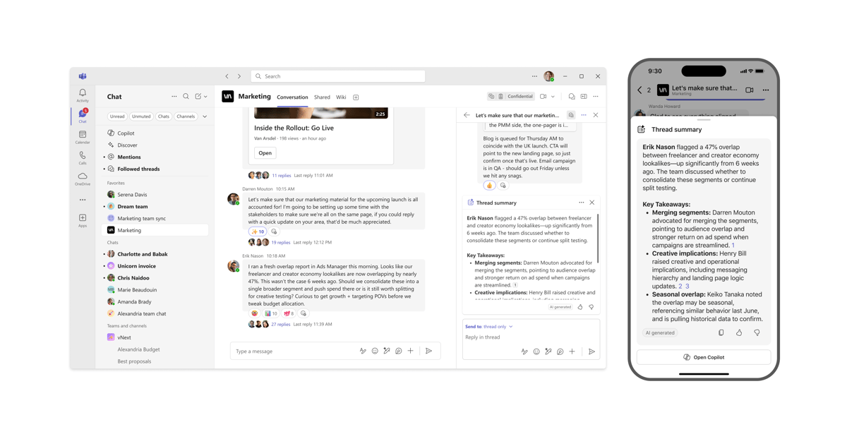 AI helpt nu gesprekken te volgen met slimme samenvattingen in kanaalthreads. In plaats van door tientallen berichten te scrollen, ziet meteen wat er besproken en besloten is en wat u nog moet bekijken. Het is samenwerking op zijn slimste, waarbij niemand achterblijft.