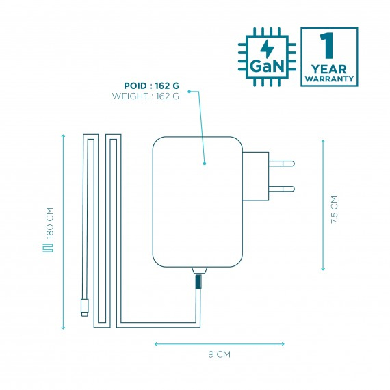 Sa conception en GaN (Nitrure de Gallium) lui confère des dimensions compactes et un poids réduit (seulement 162 g), tout en assurant une meilleure efficacité énergétique qu’un chargeur classique.