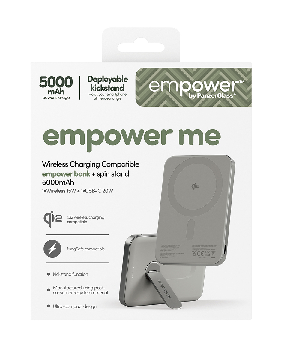 PanzerGlass empower™ by ® empower™ Bank w. Spin Stand | 5000mAh | Titanium. Capacité de la batterie: 5000 mAh. Quantité de ports USB de type C: 1. Recharge sans fil. Couleur du produit: Titane
