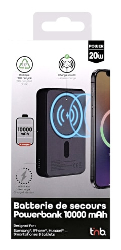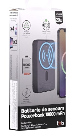 Batterie de Secours MagSafe 10 000 mAh Rechargez votre appareil en déplacement où que vous soyez. La batterie de secours MagSafe 10 000 mAh offre une solution de charge portable et élégante pour vos appareils Apple compatibles MagSafe. Conçue avec précision pour s'intégrer parfaitement à votre style de vie mobile, cette batterie compacte vous permet de rester chargé où que vous alliez. Caractéristiques Principales : Compatibilité MagSafe : Cette batterie est spécialement conçue pour les appareils Apple compatibles MagSafe, assurant une connexion magnétique sécurisée pour une charge sans effort. Capacité de 10 000 mAh : Avec une puissance de 20W via son port USB-C, cette batterie offre une recharge fiable et rapide, assurant que vous ne soyez jamais à court de batterie lorsque vous en avez le plus besoin. Design Compact et Léger : Son design fin et léger en fait l'accessoire idéal pour les déplacements, se glissant facilement dans votre poche ou votre sac à main sans ajouter de poids supplémentaire. Fonction Stand : Grâce à son pied métallique repliable vous pouvez utiliser votre powerbank comme un support de téléphone, comme ça vous pouvez visionner vos contenus digitaux favoris sans tenir votre smartphone dans vos mains tout en le rechargeant. Matériaux de haute qualité et écoresponsables : Fabriquée avec des matériaux de qualité supérieure et respectueux de l’environnement. Tout le plastique est 100% recyclé, cette batterie de secours est résistante aux chocs et aux rayures, assurant une durabilité à long terme. Indicateurs LED : Les indicateurs LED intégrés vous permettent de vérifier rapidement le niveau de charge restant, vous offrant un contrôle total sur l'autonomie de votre batterie. Recharge Facile : Rechargez la batterie elle-même à l'aide d'un câble USB-C inclus, assurant une compatibilité maximale avec vos autres périphériques. La batterie de secours MagSafe 10 000 mAh est l'accessoire parfait pour ceux qui recherchent une solution de charge portable, rapide et élégante. Ne soyez jamais à court de batterie, où que vous soyez. Vous disposez d'un anneau métalique dans le pack qui vous permet de convertir votre smartphone non MagSafe en compatible MagSafe