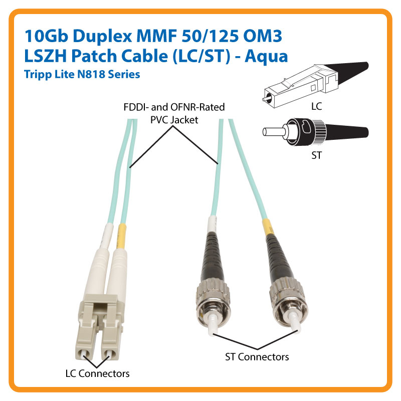 Tripp Lite N818-05M. Longueur de câble: 5 m, Type de fibre optique: OM3, Connecteur 1: 2x LC, Connecteur 2: 2x ST, Diamètre principal: 50 µm