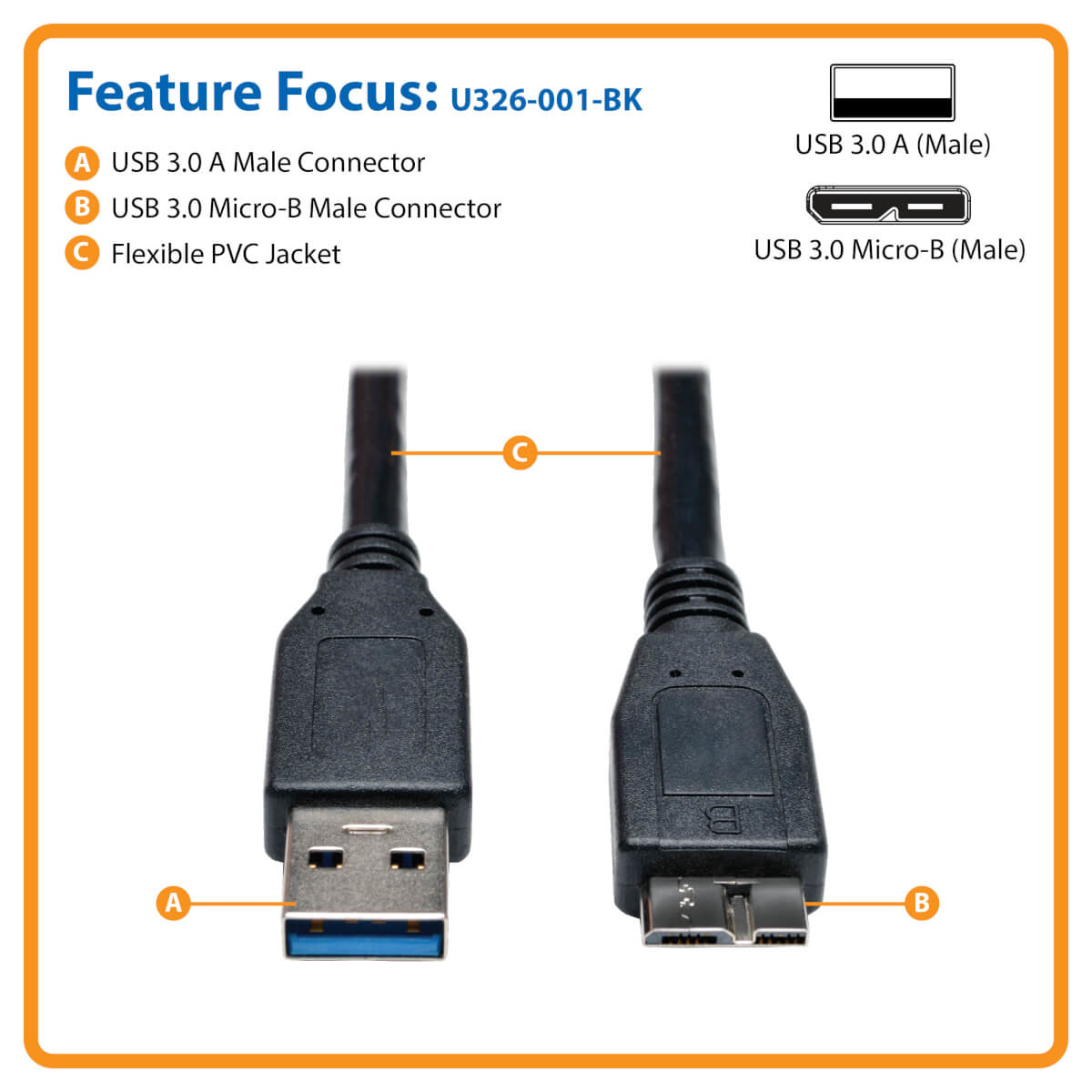 Tripp Lite U326-001-BK, 0,3 m, USB A, Micro-USB B, USB 3.2 Gen 1 (3.1 Gen 1), Mâle/Mâle, Noir