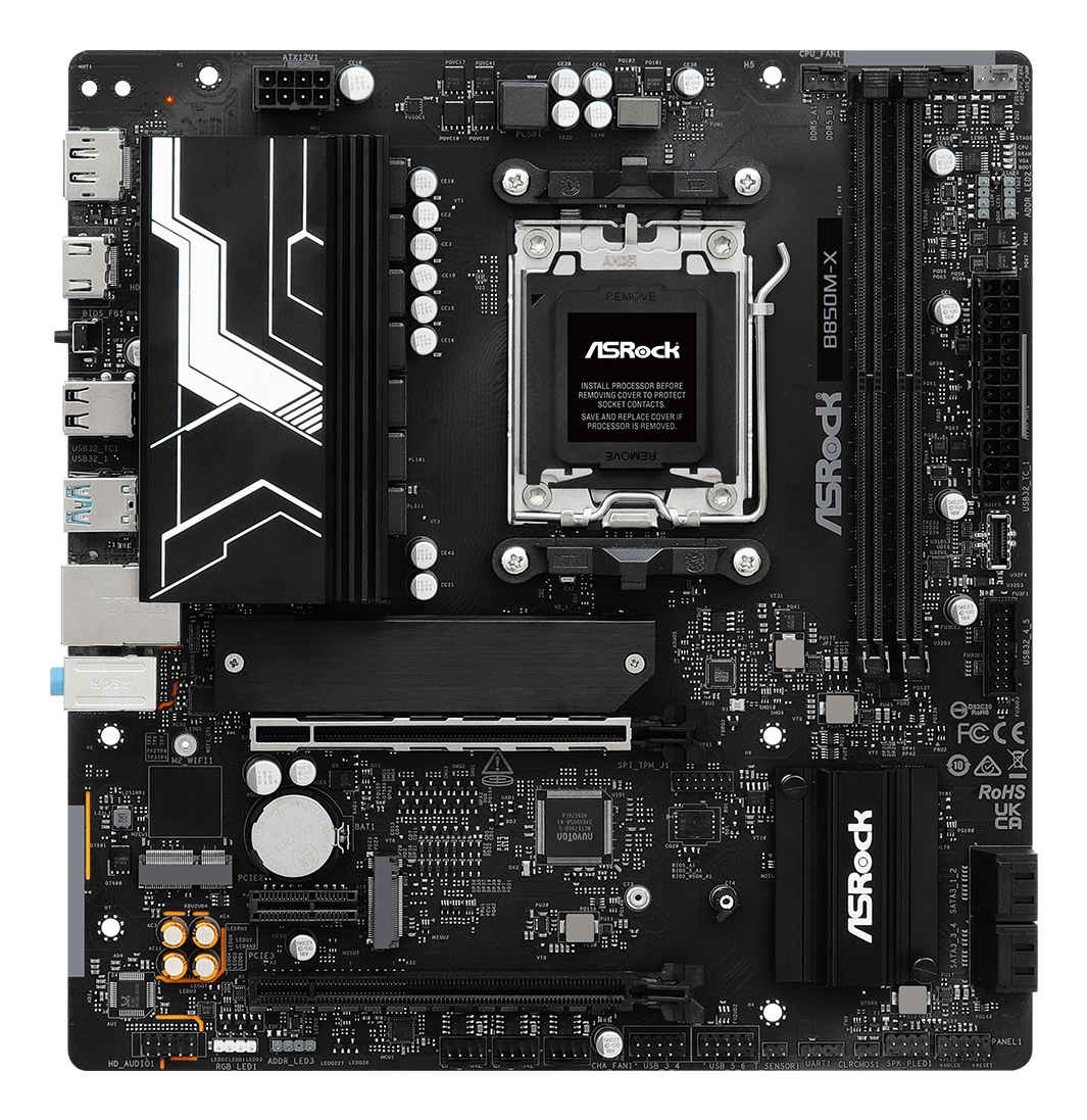 Asrock B850M-X. Fabricant de processeur: AMD, Socket de processeur (réceptable de processeur): Emplacement AM5, Processeurs compatibles: AMD Ryzen 7000 Series, AMD Ryzen 8000 Series, AMD Ryzen 9000 Series. Types de mémoire pris en charge: DDR5-SDRAM, Mémoire interne maximale: 128 Go, Type de support (slot): DIMM. Interfaces de lecteur de stockage prises en charge: PCI Express 4.0, PCI Express 5.0, SATA III, Types de lecteurs de stockage pris en charge: HDD & SSD, Niveaux RAID: 0, 1, 10. Résolution maximale: 3840 x 2160 pixels. Connecteur USB: USB Type-A, USB Type-C
