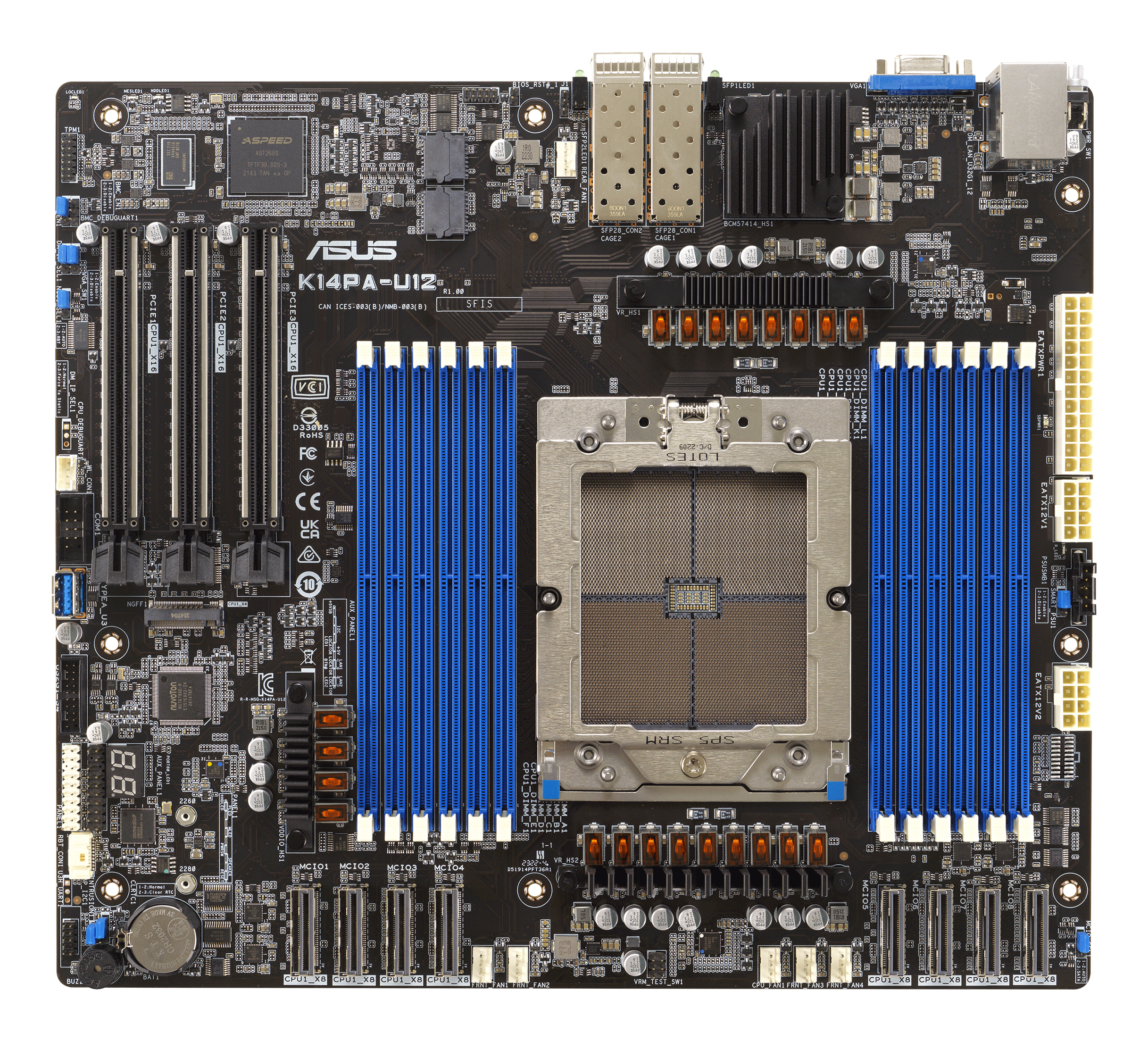 ASUS K14PA-U12/ASMB11. Fabricant de processeur: AMD, Socket de processeur (réceptable de processeur): Socket SP5, Processeurs compatibles: AMD EPYC 9004. Types de mémoire pris en charge: DDR5-SDRAM, Mémoire interne maximale: 3,07 To, Prise en charge de la mémoire vitesse d'horloge: 4800 MHz. Interfaces de lecteur de stockage prises en charge: M.2. Famille d'adaptateur graphique: ASPEED, Adaptateur graphique: AST2600, Modèle d'adaptateur graphique inclus: Aspeed AST2600. Type d'interface Ethernet: 25 Gigabit Ethernet