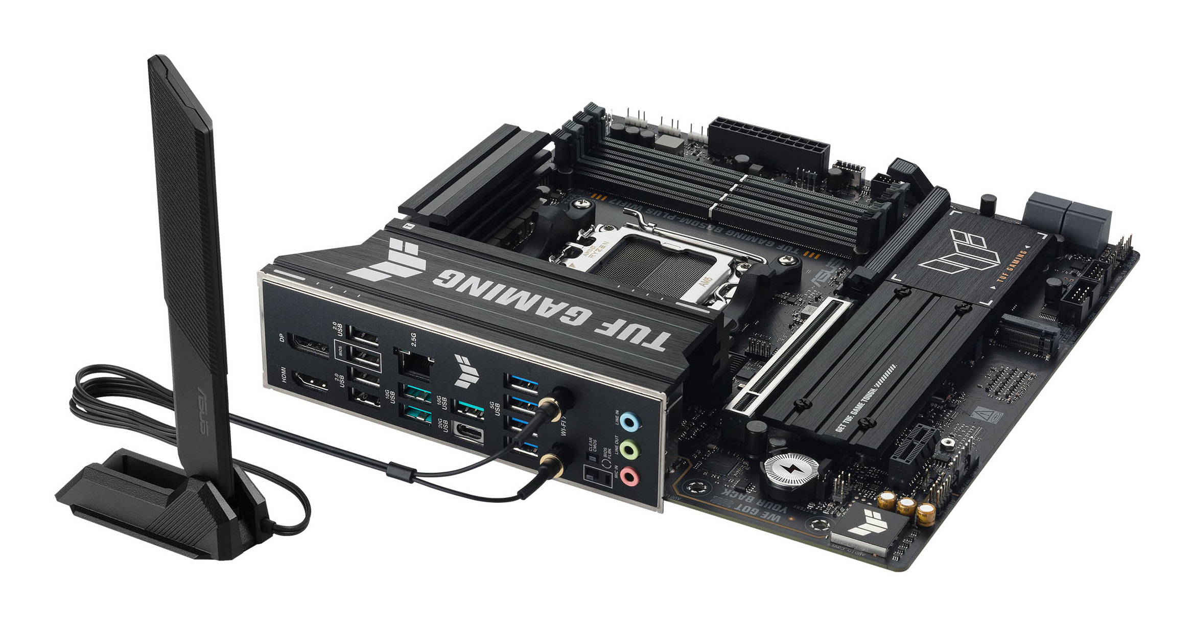 ASUS TUF GAMING B850M-PLUS WIFI7. Fabricant de processeur: AMD, Socket de processeur (réceptable de processeur): Emplacement AM5, Processeurs compatibles: AMD Ryzen 7000 Series, AMD Ryzen 8000 Series, AMD Ryzen 9000 Series. Types de mémoire pris en charge: DDR5-SDRAM, Mémoire interne maximale: 256 Go, Type de support (slot): DIMM. Interfaces de lecteur de stockage prises en charge: PCI Express 4.0, PCI Express 5.0, Types de lecteurs de stockage pris en charge: HDD & SSD, Niveaux RAID: 0, 1, 5, 10. Type d'interface Ethernet: 2.5 Gigabit Ethernet, Norme Wi-Fi: Wi-Fi 7 (802.11be), Standards wifi: Wi-Fi 7 (802.11be). composant pour: PC, Elément de forme de carte mère: micro ATX, famille de composant de produits: AMD