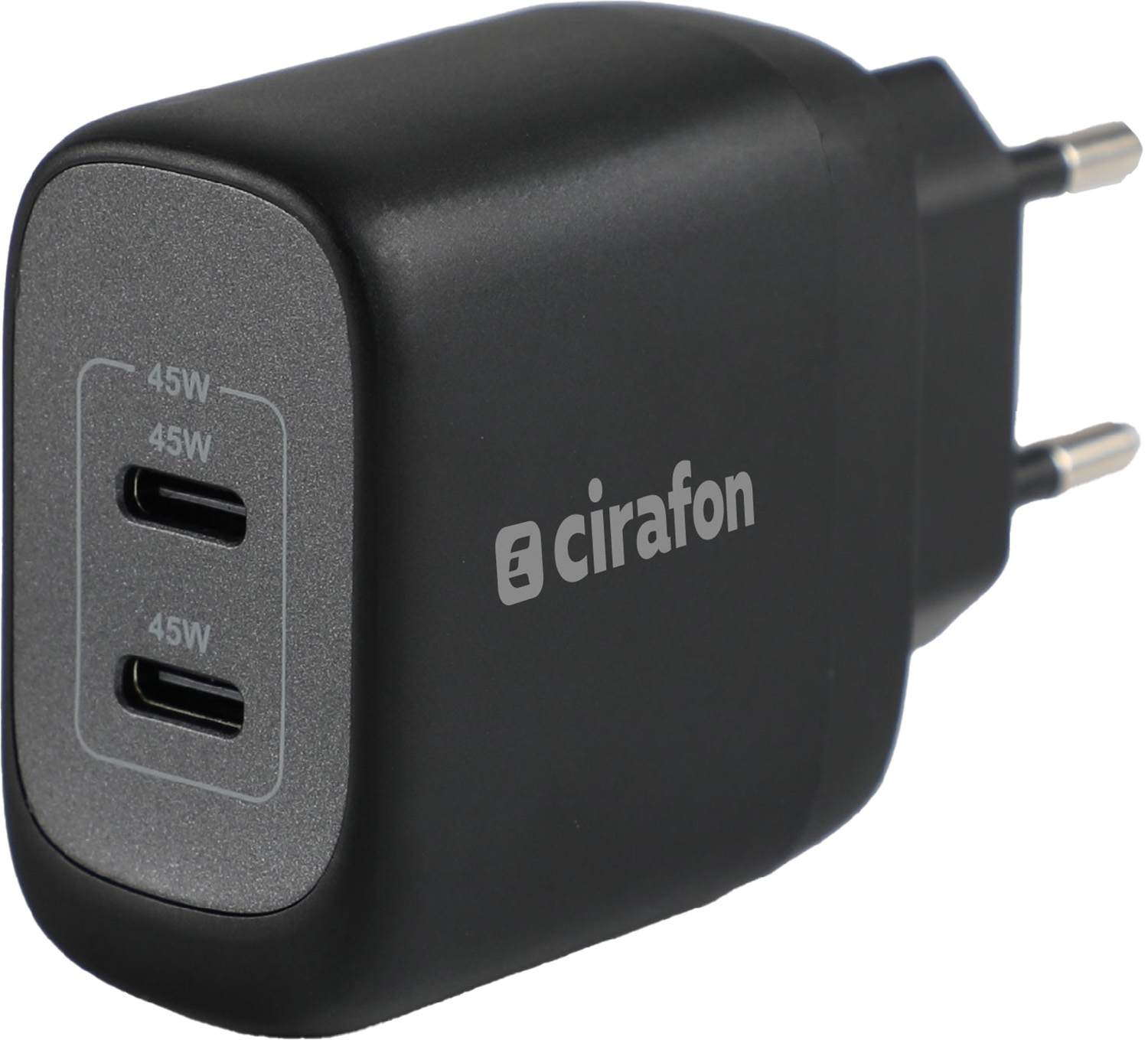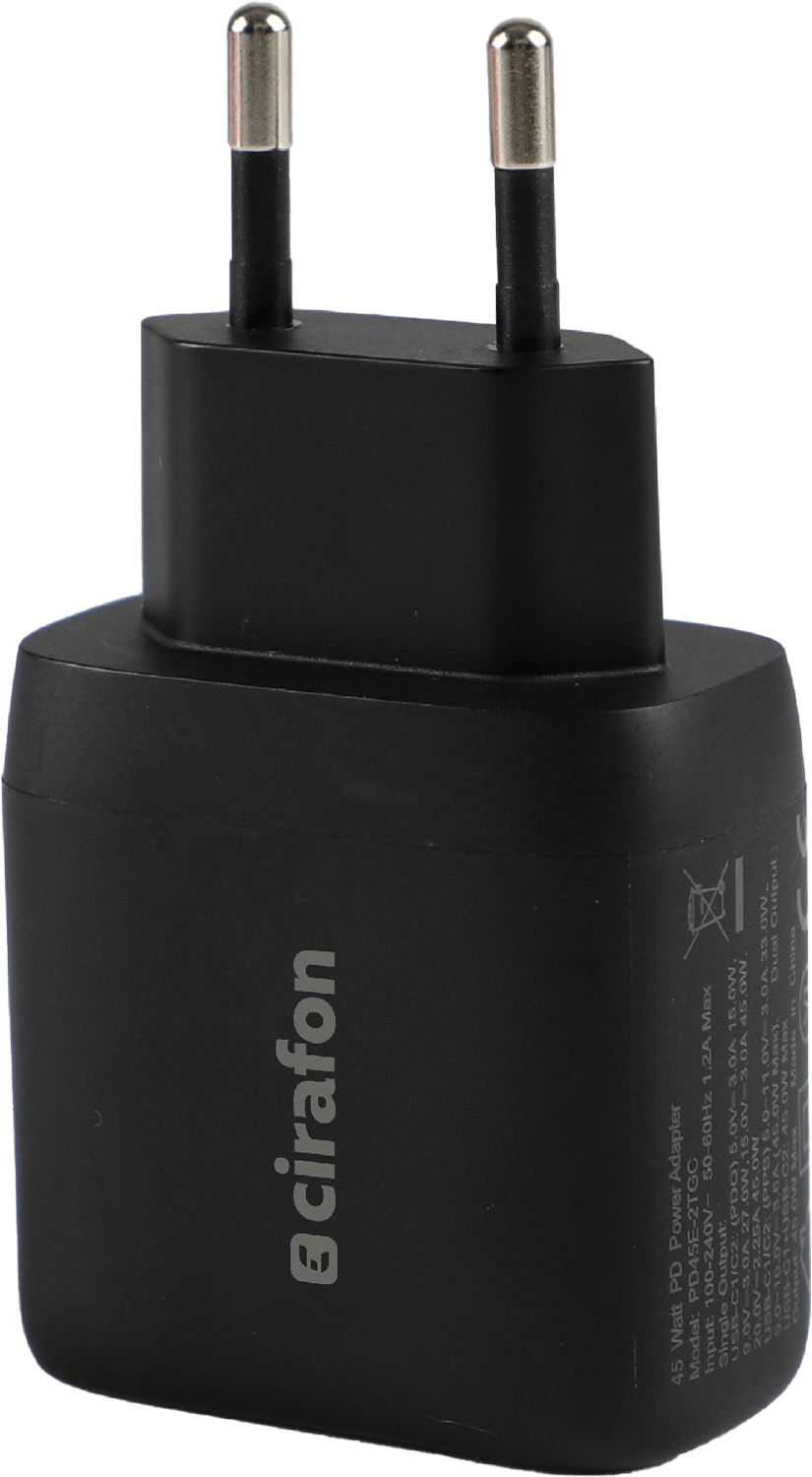 Cirafon CC45WC2B. Type de chargeur: Intérieure, Type de source d'alimentation: Secteur, Compatibilité de chargeur: Lecteur e-book, Fitness tracker, Manette de jeux, Casques, Casque, Téléphone portable,.... Tension d'entrée: 110 - 240 V, Tension de sortie (max): 20 V. Quantité de ports USB de type C: 2, Charge rapide. Couleur du produit: Noir