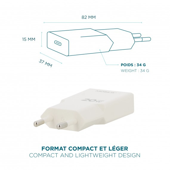Chargeur 20 W, USB-C, GaN, Blanc, 82 × 37 × 15 mm, 34 g