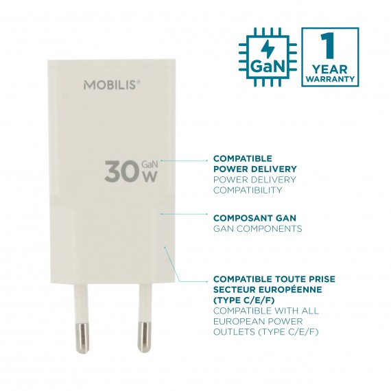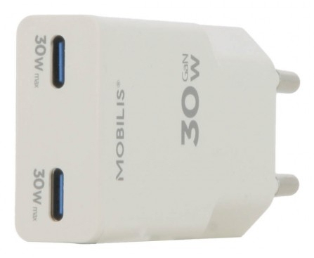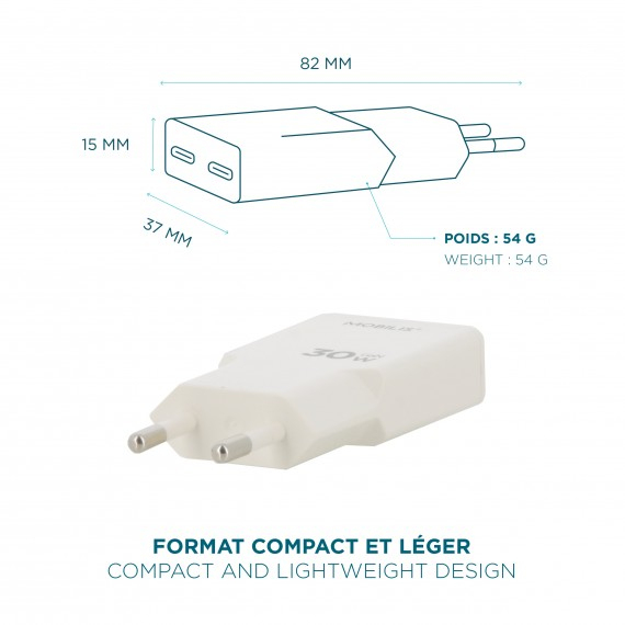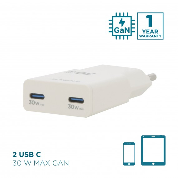 Chargeur 30 W, 2 x USB-C, GaN, blanc, 82 × 37 × 15 mm, 52 g