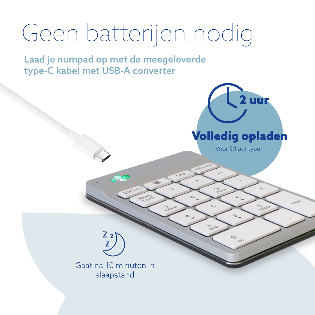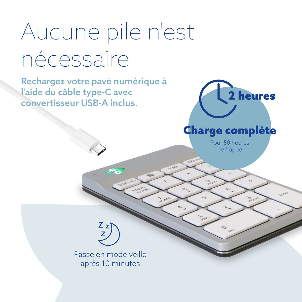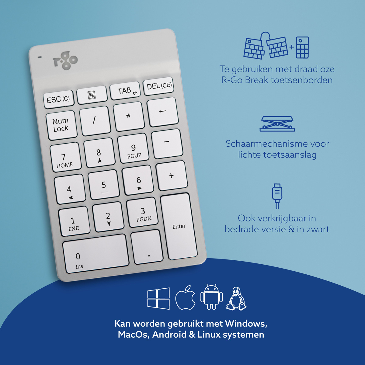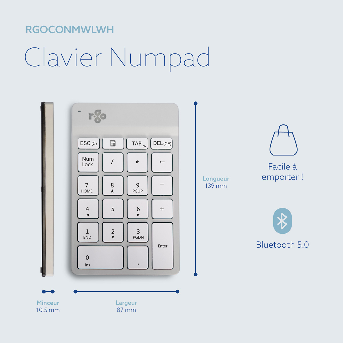 Clavier R-Go Numpad Break, clavier numérique ergonomique avec logiciel de pause, bluetooth, blanc