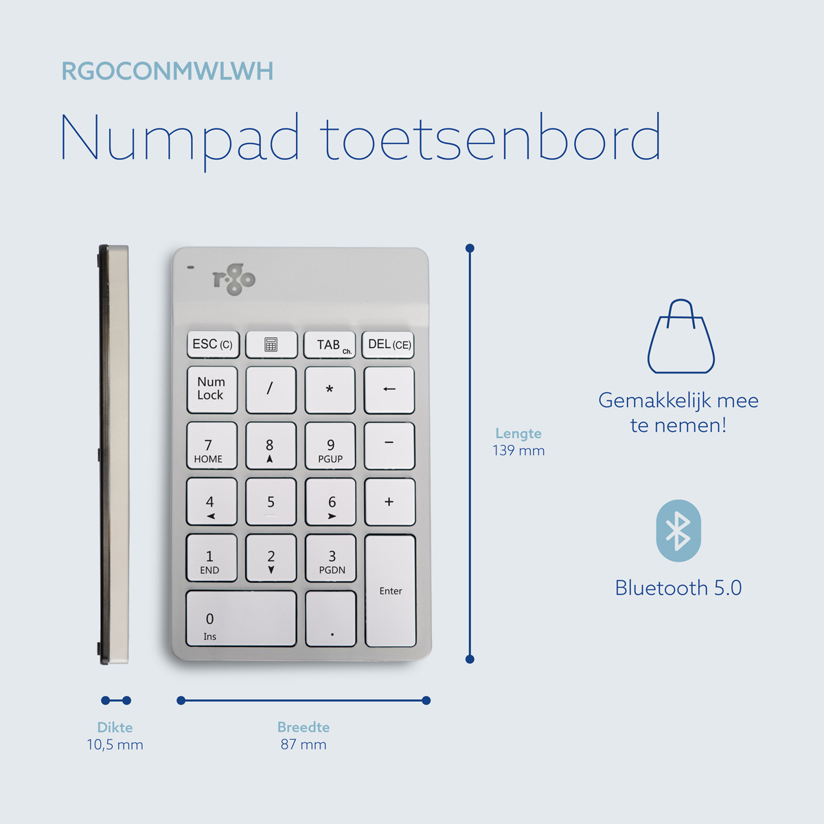 R-Go Tools Clavier R-Go Numpad Break, clavier numérique ergonomique avec logiciel de pause, bluetooth, blanc, Bluetooth, Ordinateur portable, 1,5 m, Blanc