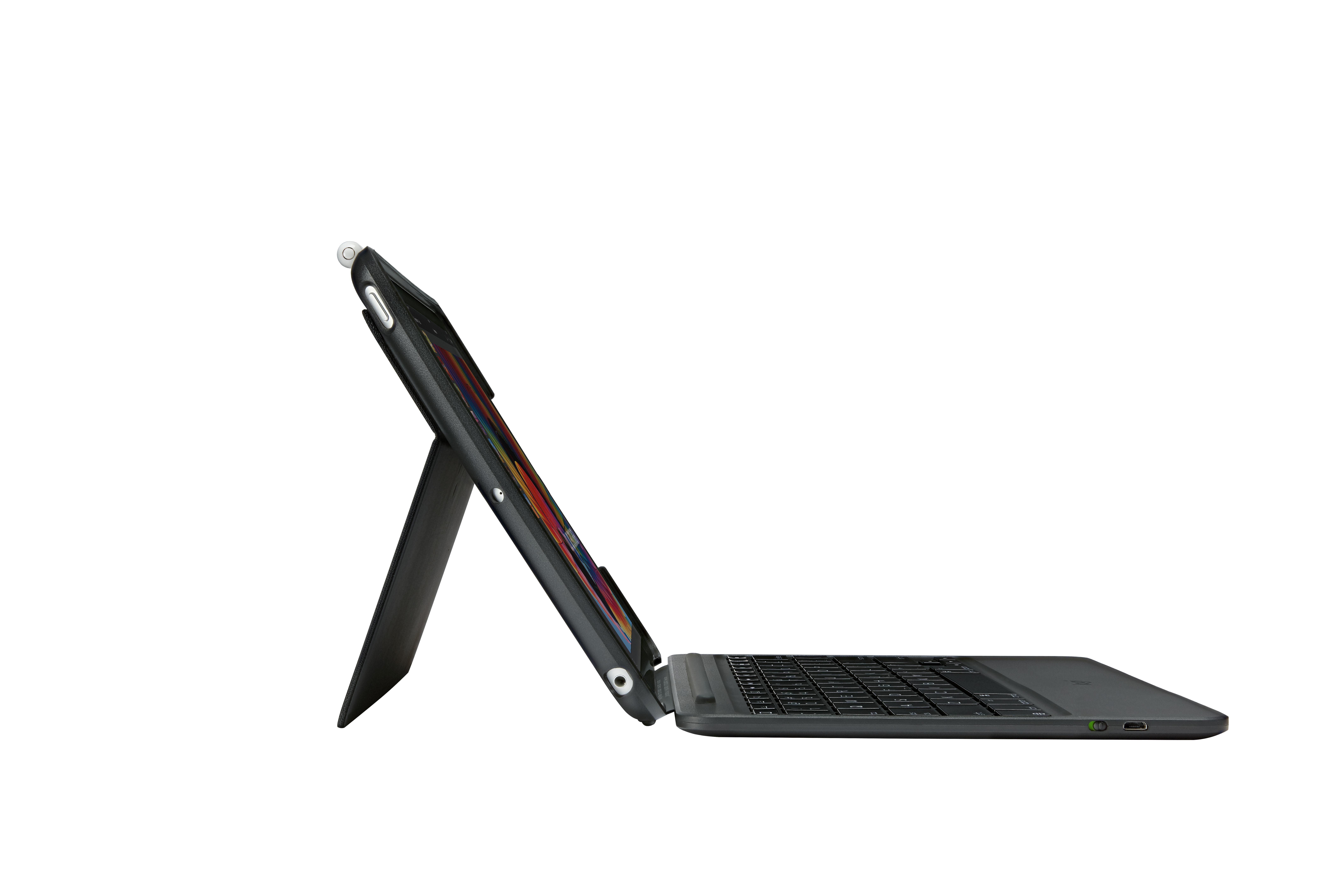 Logitech SLIM COMBO Case with Detachable Backlit Bluetooth Keyboard for iPad 5th & 6th generation. Disposition des touches du clavier: AZERTY, Language du clavier: Français. Compatibilité de marque: Apple, Compatibilité: iPad 5th, 6th, Couleur du produit: Graphite. Technologie de connectivité: Sans fil, Interface de l'appareil: Bluetooth. Source d'alimentation: Station d'accueil, Technologie batterie: Lithium Polymère (LiPo), Capacité de la batterie: 500 mAh. Largeur: 177,6 mm, Profondeur: 24,5 mm, Hauteur: 246,2 mm