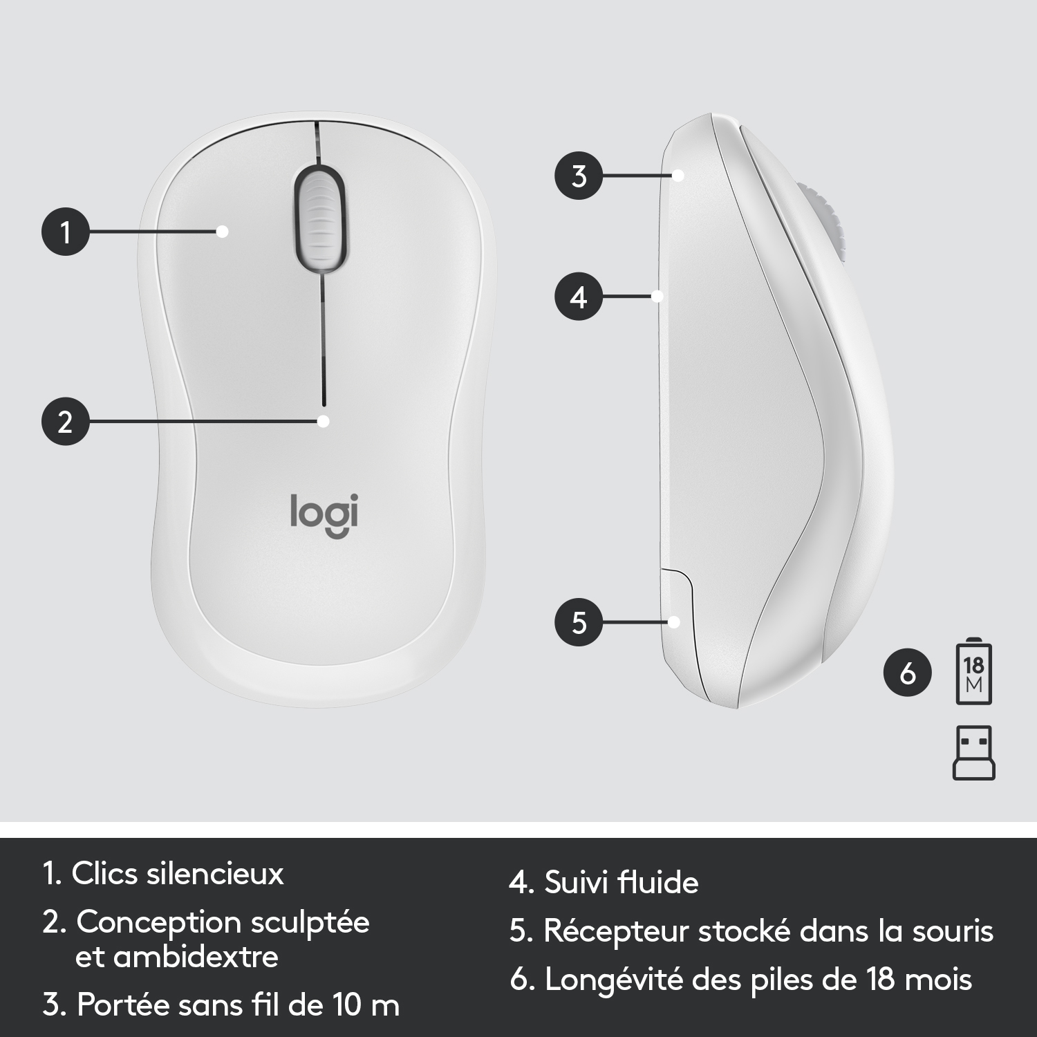 Logitech MK295 Silent, Taille réelle (100 %), Sans fil, RF sans fil, AZERTY, Blanc, Souris incluse