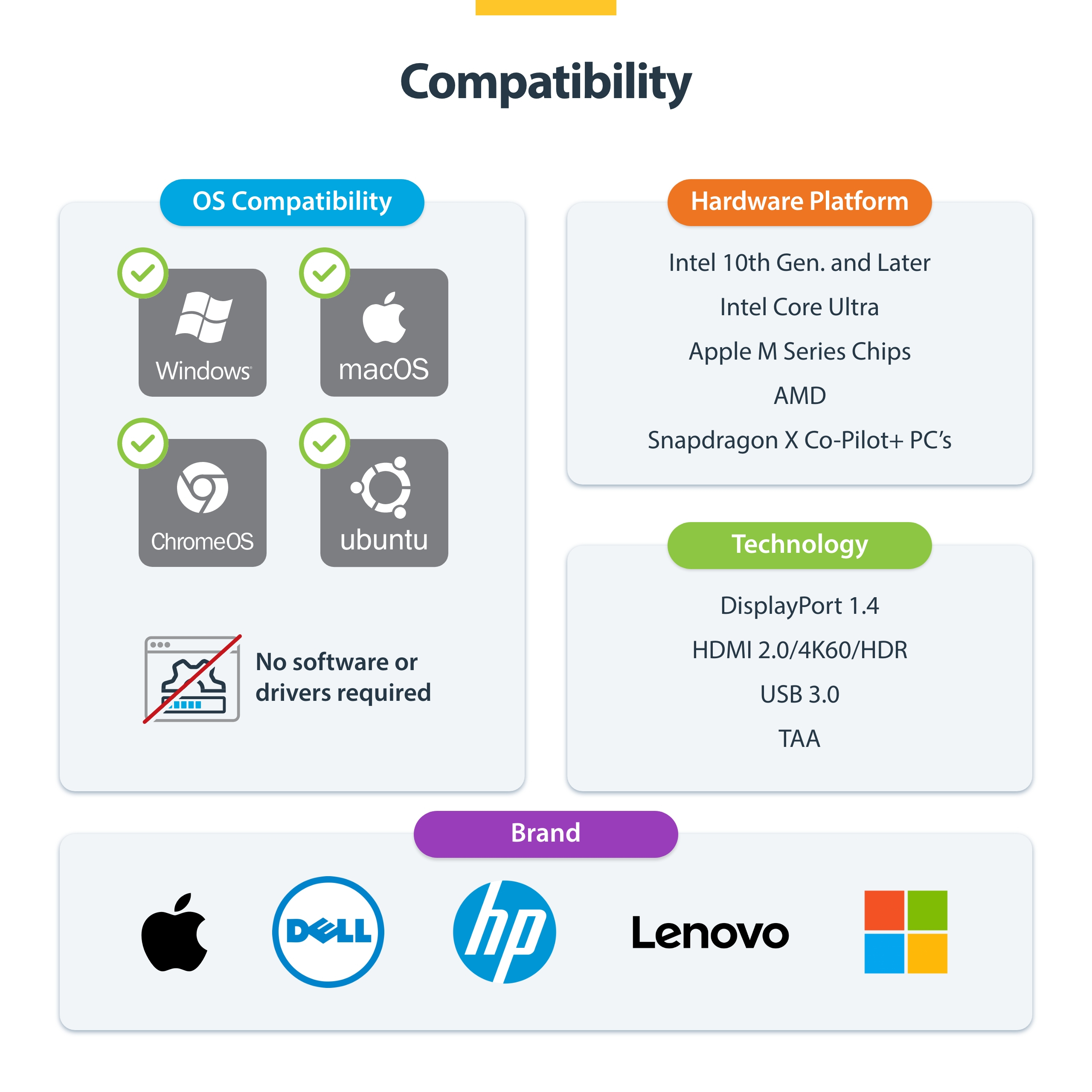 Ce commutateur KVM conforme à la norme TAA prend en charge le contrôle via BIOS/UEFI et fonctionne avec tous les systèmes d'exploitation; y compris Windows, macOS, ChromeOS et Linux, sans nécessiter de logiciel. Il est compatible avec toutes les plateformes matérielles, telles qu'Intel; AMD et Apple.