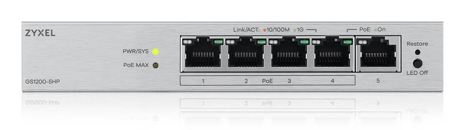 Zyxel GS1200-5HPV3, Géré, L2, Gigabit Ethernet (10/100/1000), Full duplex, Connexion Ethernet, supportant l'alimentation via ce port (PoE), Bureau