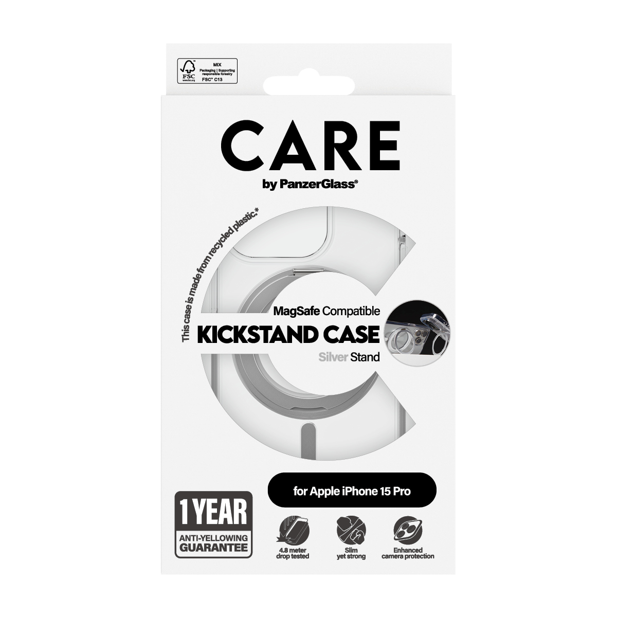 PanzerGlass CARE™ by ® Case Transparent w. Silver Kickstand & MagSafe iPhone 15 Pro, Housse, Apple, Apple - iPhone 15 Pro, 15,5 cm (6.12"), Transparent