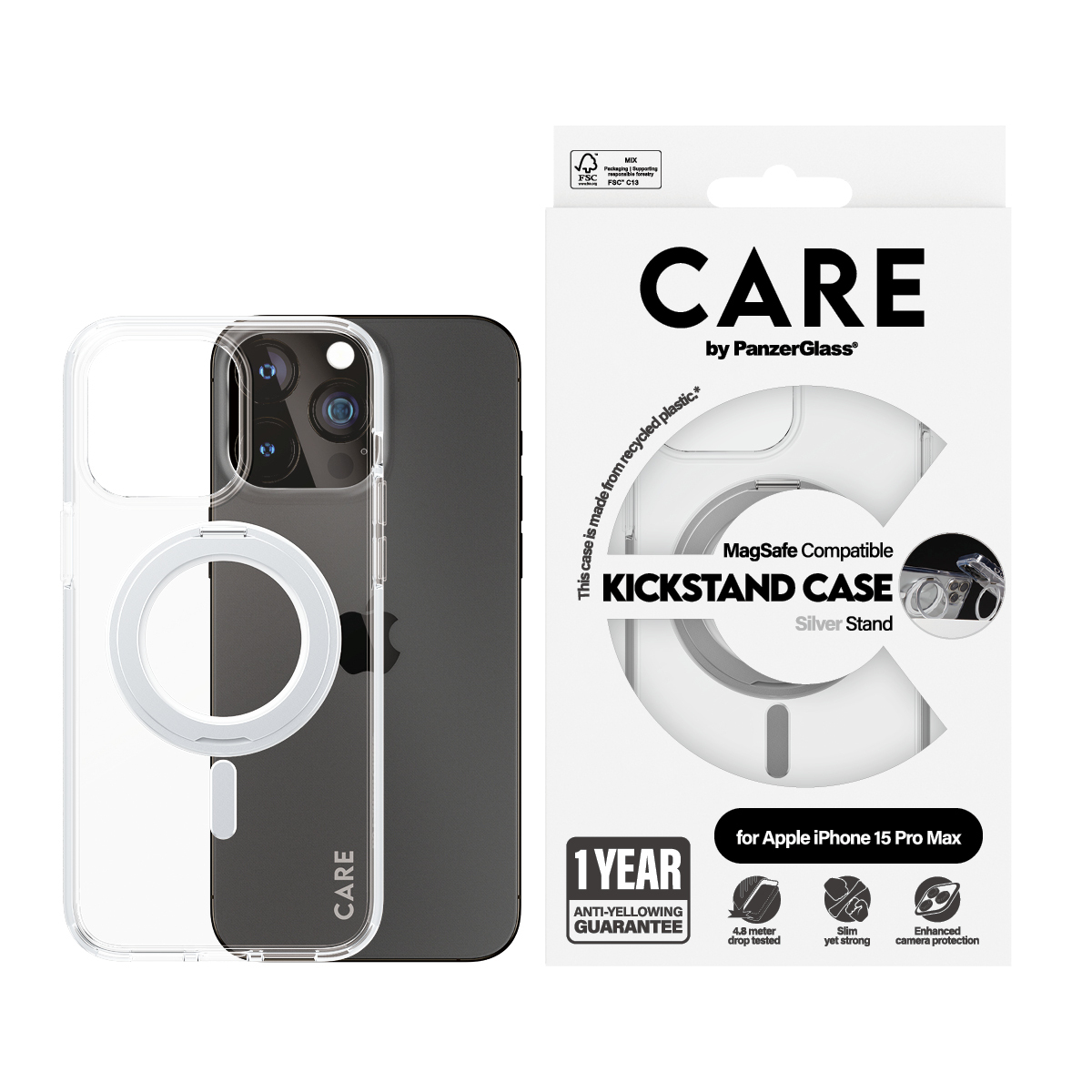 PanzerGlass CARE™ by ® Case Transparent w. Silver Kickstand & MagSafe iPhone 15 Pro Max, Housse, Apple, Apple - iPhone 15 Pro Max, 17 cm (6.7"), Transparent