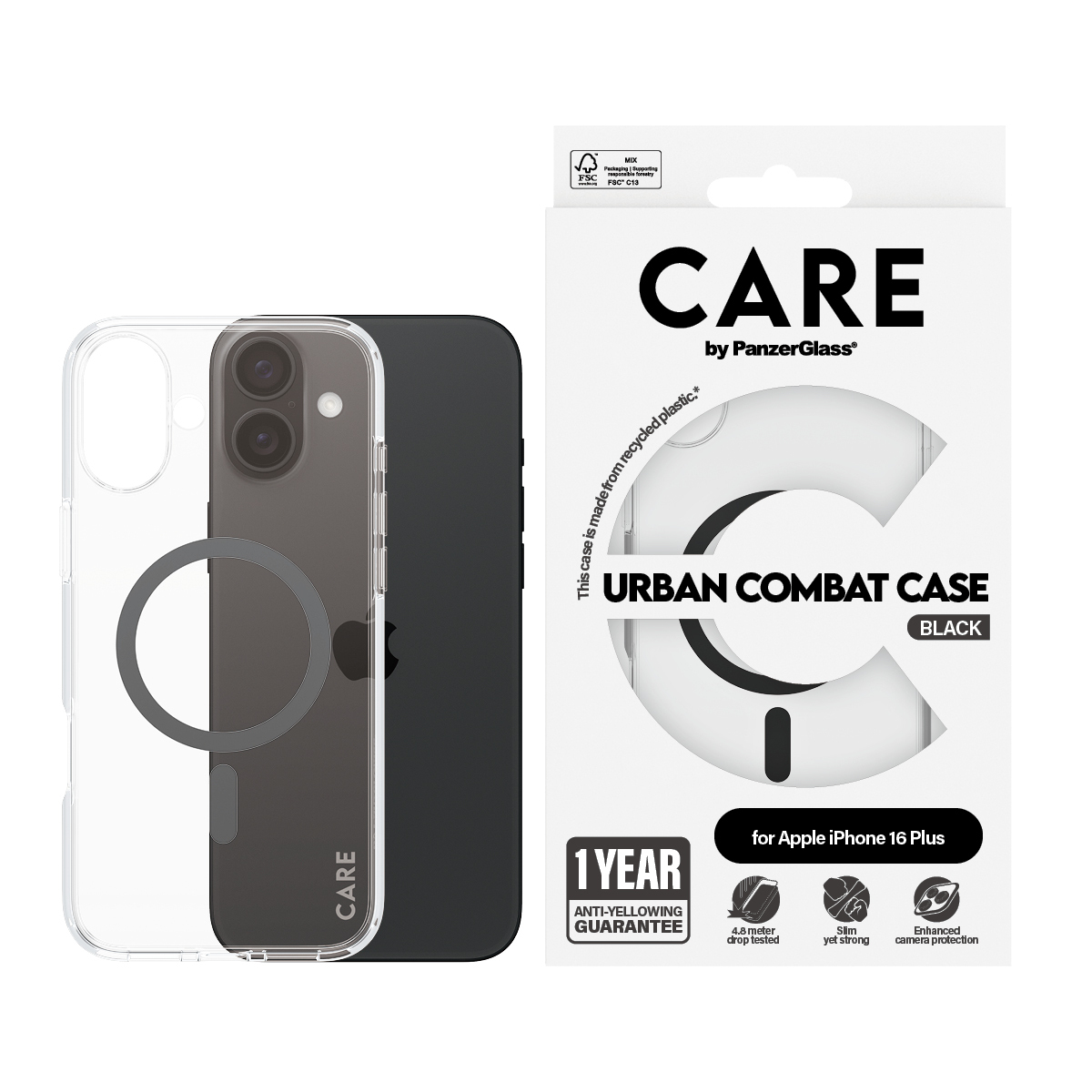 PanzerGlass CARE™ by ® Urban Combat Case Transparent w. Black MagSafe iPhone 16 Plus. Type d'étui: Housse, Compatibilité de marque: Apple, Compatibilité: Apple - iPhone 16 Plus, Couleur du produit: Noir