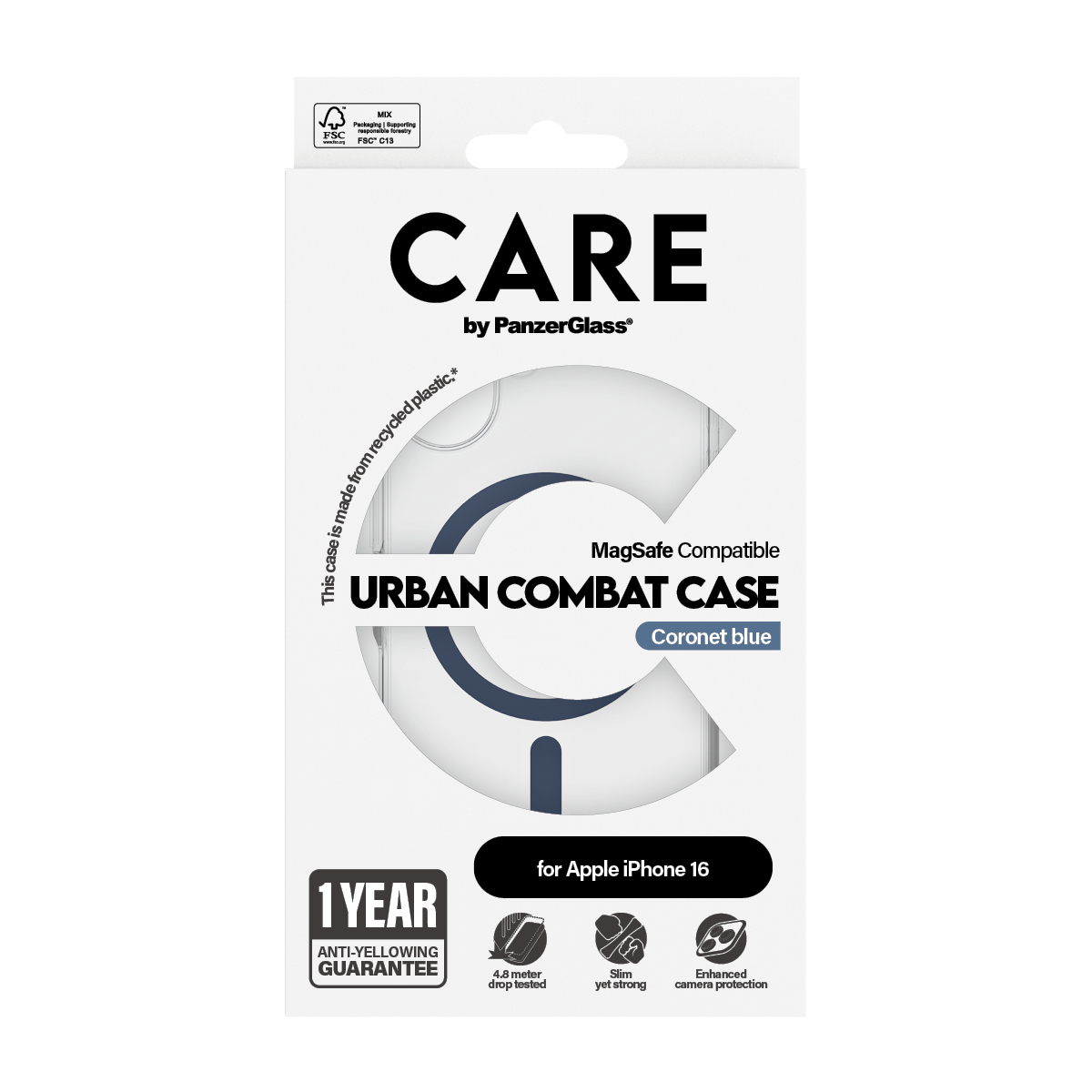 PanzerGlass CARE™ by ® Urban Combat Case Transparent w. Blue MagSafe iPhone 16. Type d'étui: Housse, Compatibilité de marque: Apple, Compatibilité: Apple - iPhone 16, Couleur du produit: Transparent