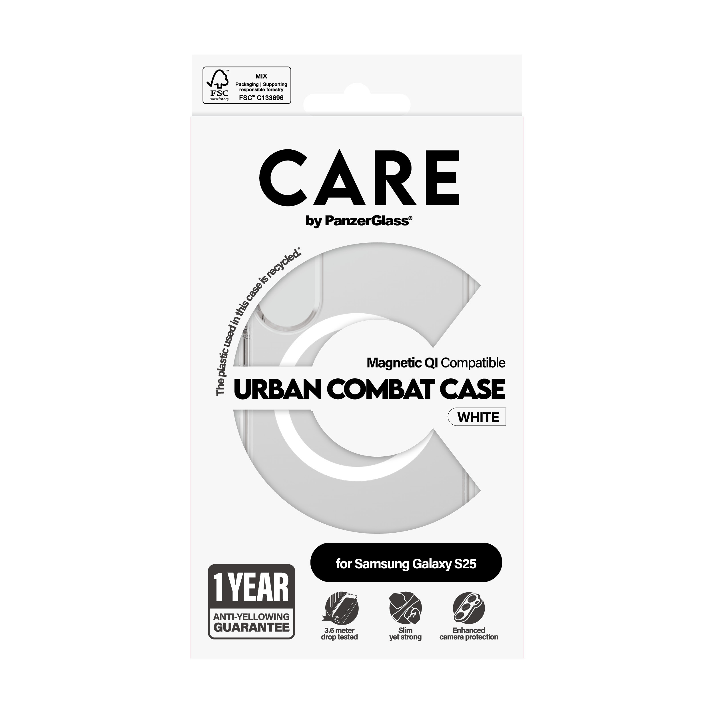 PanzerGlass CARE™ by ® Urban Combat Case Transparent w. White Qi Compatible Samsung Galaxy S25. Type d'étui: Housse, Compatibilité de marque: Samsung, Compatibilité: Samsung - Galaxy S25, Couleur du produit: Transparent