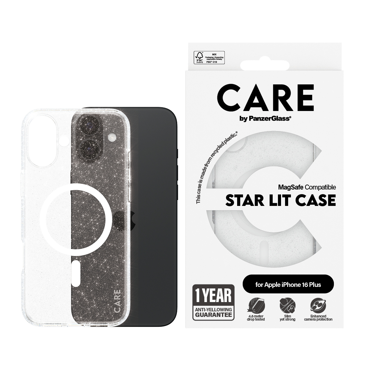 PanzerGlass CARE™ by ® Urban Combat Case Star Lit w. White MagSafe iPhone 16 Plus. Type d'étui: Housse, Compatibilité de marque: Apple, Compatibilité: Apple - iPhone 16 Plus, Couleur du produit: Transparent