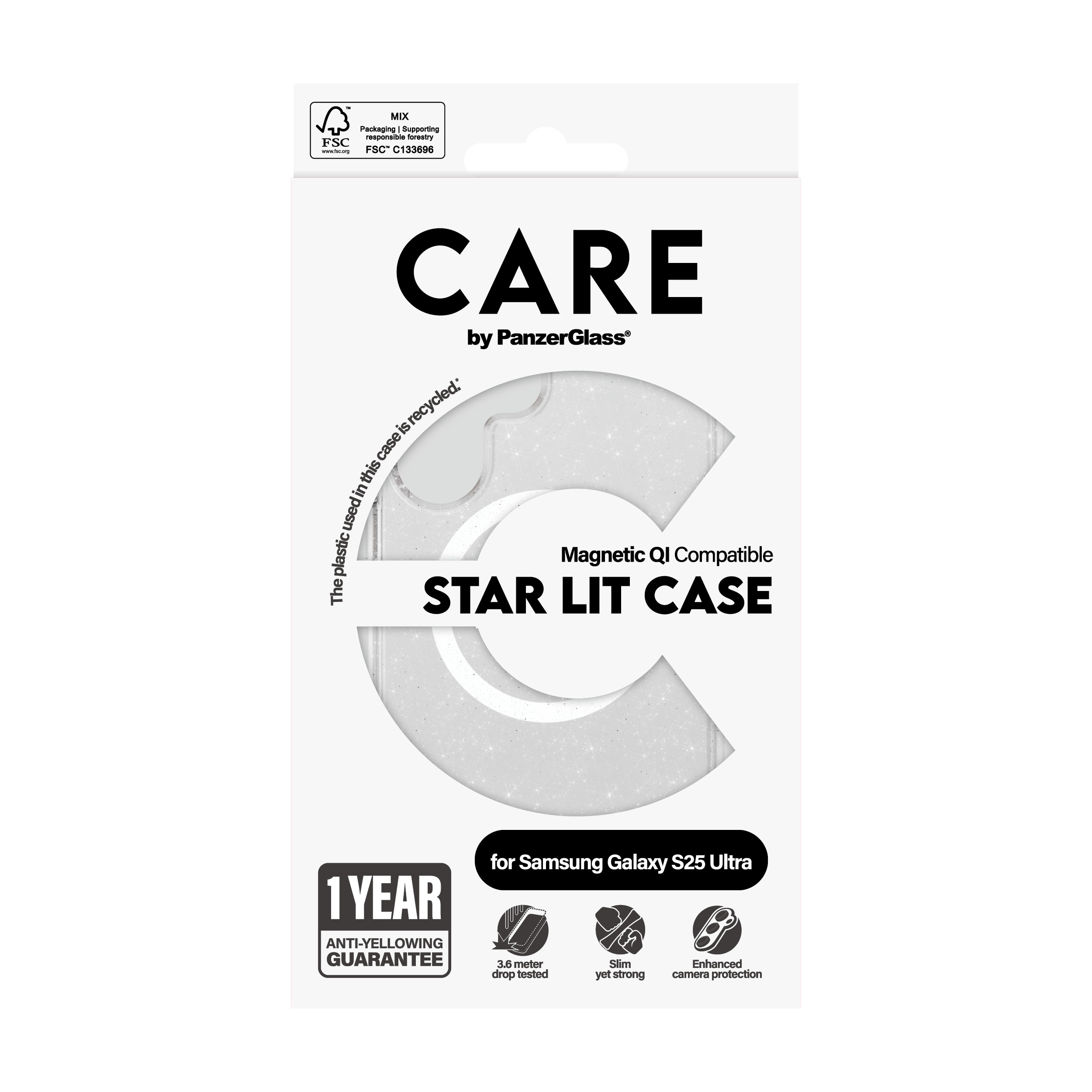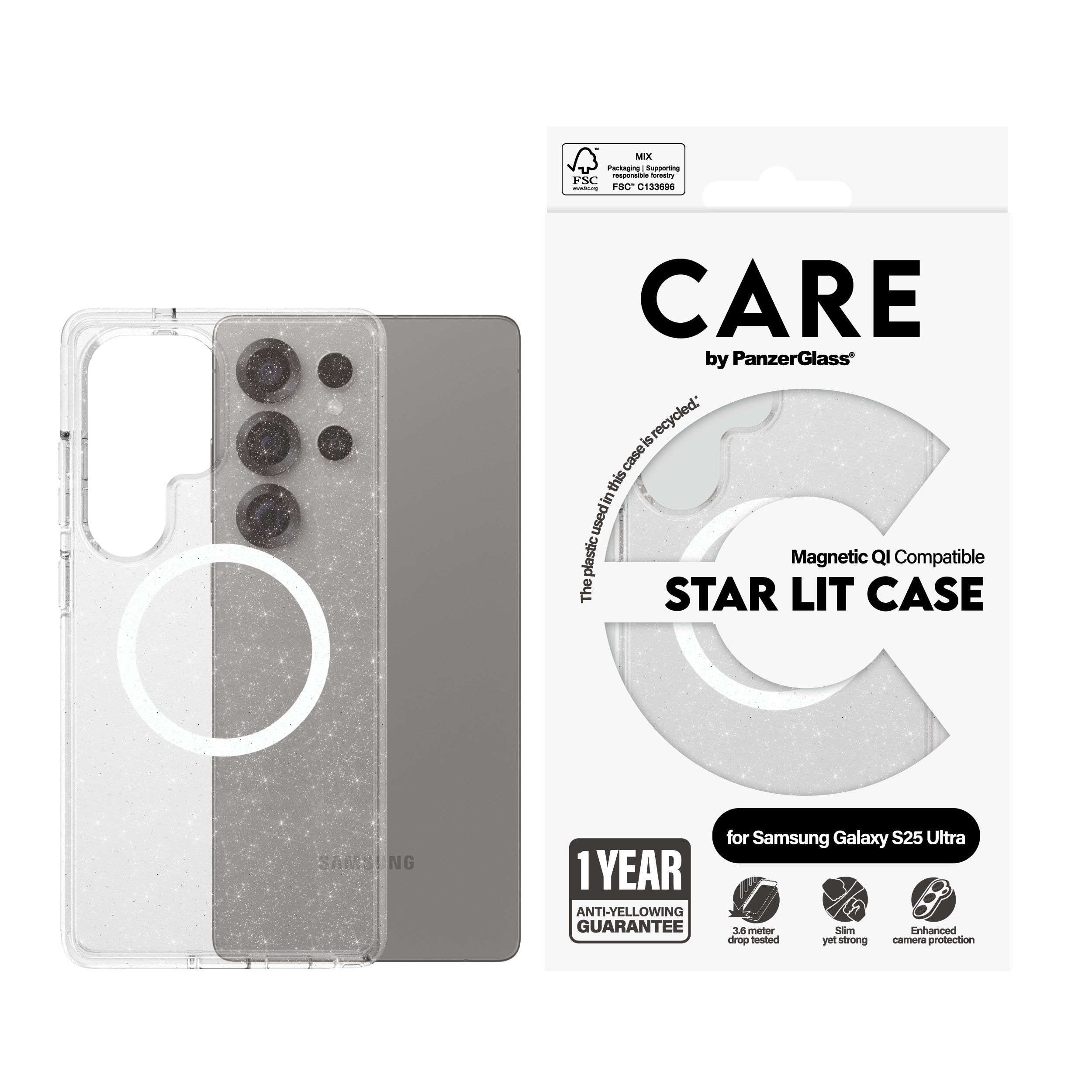 PanzerGlass CARE™ by ® Urban Combat Case Star Lit w. White Qi Compatible Samsung Galaxy S25 Ultra. Type d'étui: Housse, Compatibilité de marque: Samsung, Compatibilité: Samsung - Galaxy S25 Ultra, Couleur du produit: Transparent