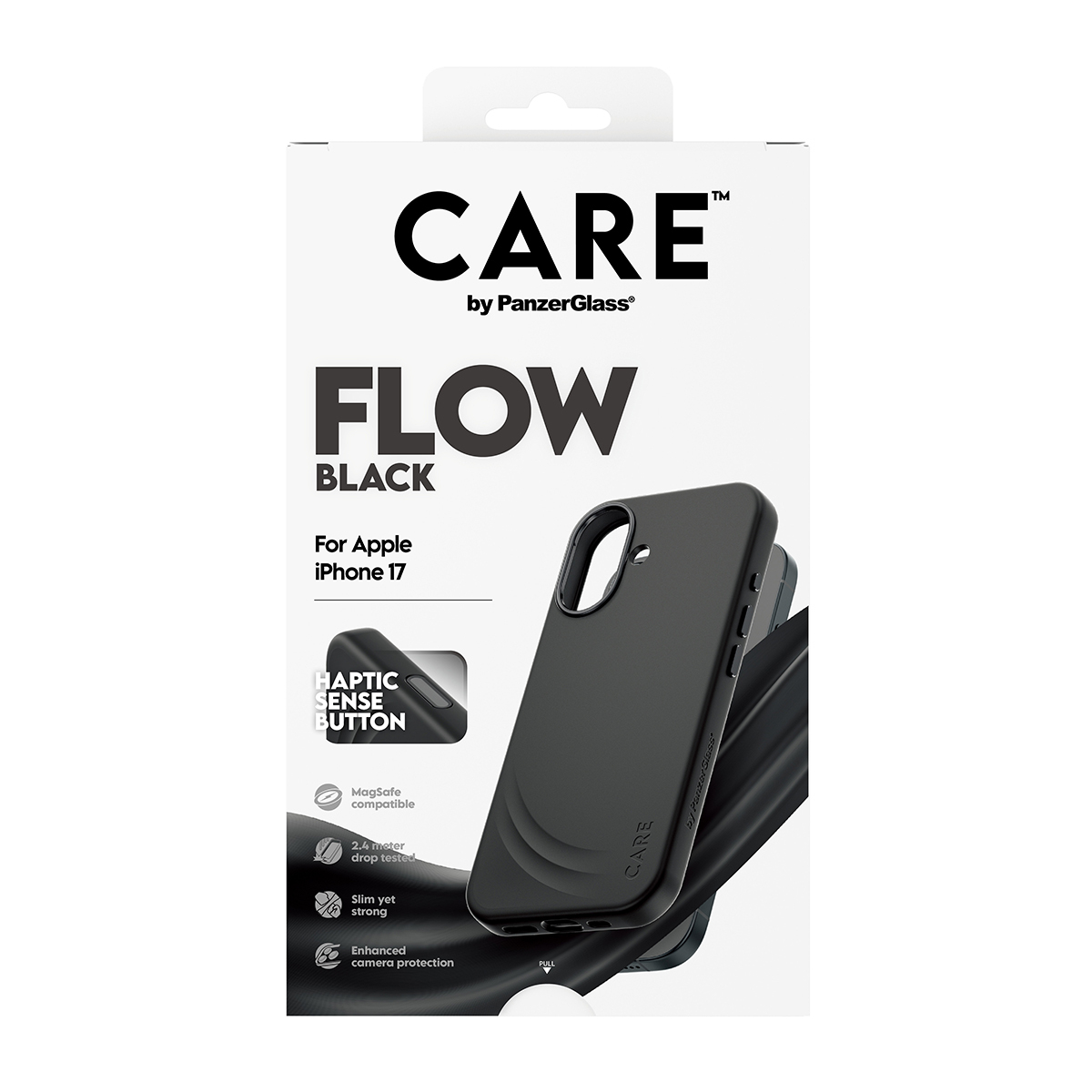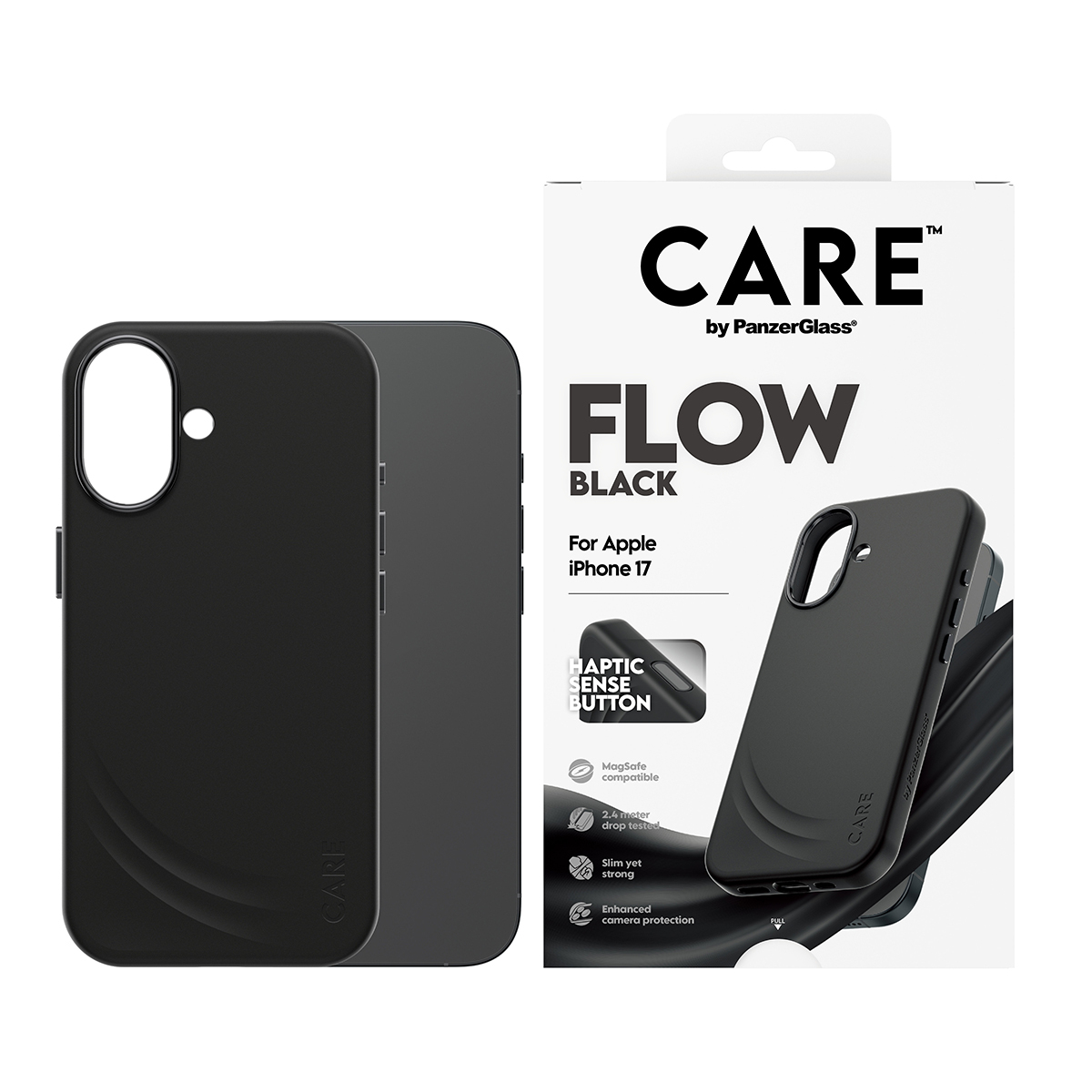 PanzerGlass CARE™ by ® Flow Case Black w. Haptic Button & MagSafe iPhone 17. Type d'étui: Housse, Compatibilité de marque: Apple, Compatibilité: Apple - iPhone 17, Couleur du produit: Noir