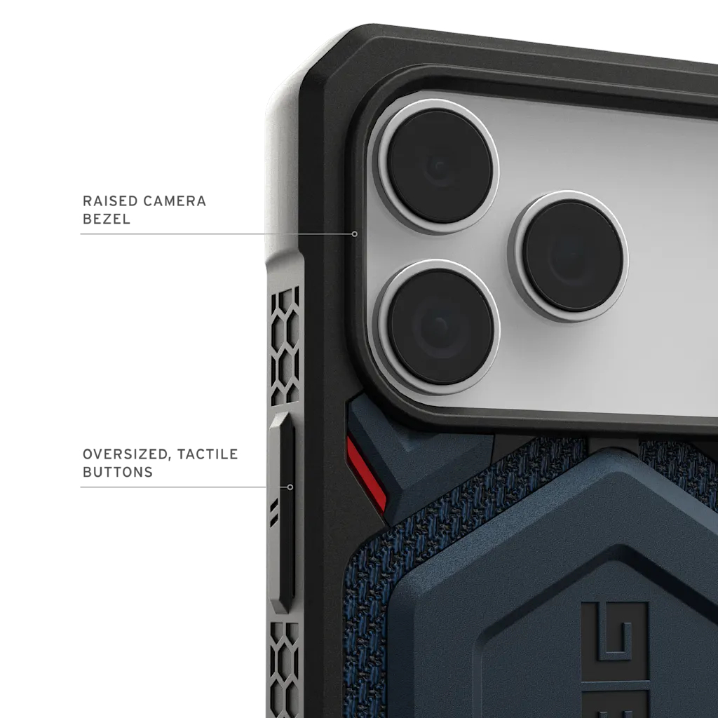 Urban Armor Gear Monarch Pro. Type d'étui: Housse, Compatibilité de marque: Apple, Compatibilité: iPhone 17 Pro Max, Taille maximale de l’écran: 17,5 cm (6.9"), Coloration de surface: Monochromatique, Couleur du produit: Noir, Bleu