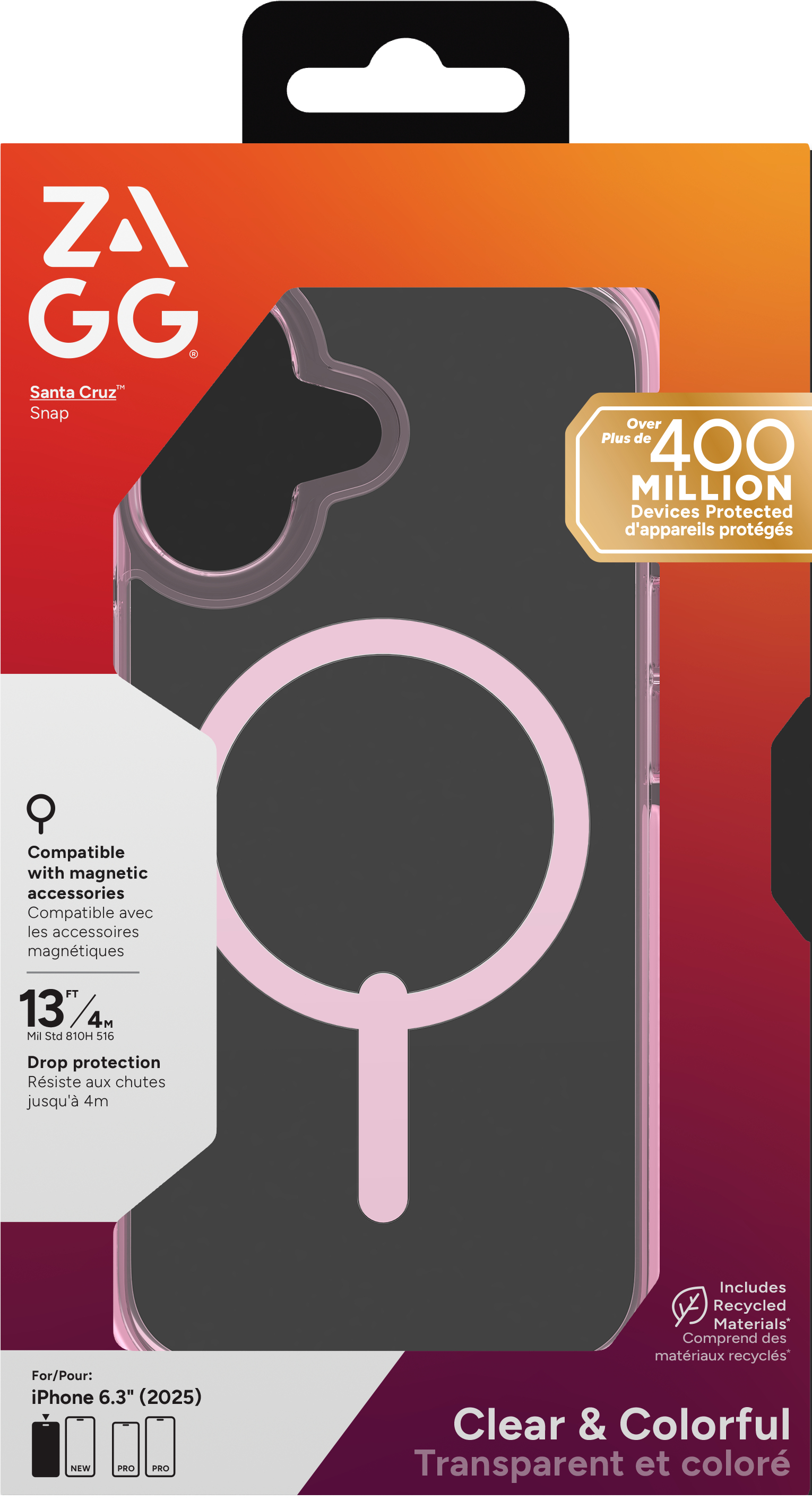 ZAGG Santa Cruz Snap. Type d'étui: Housse, Compatibilité de marque: Apple, Compatibilité: iPhone 17, Taille maximale de l’écran: 16 cm (6.3"), Couleur du produit: Rose, Transparent