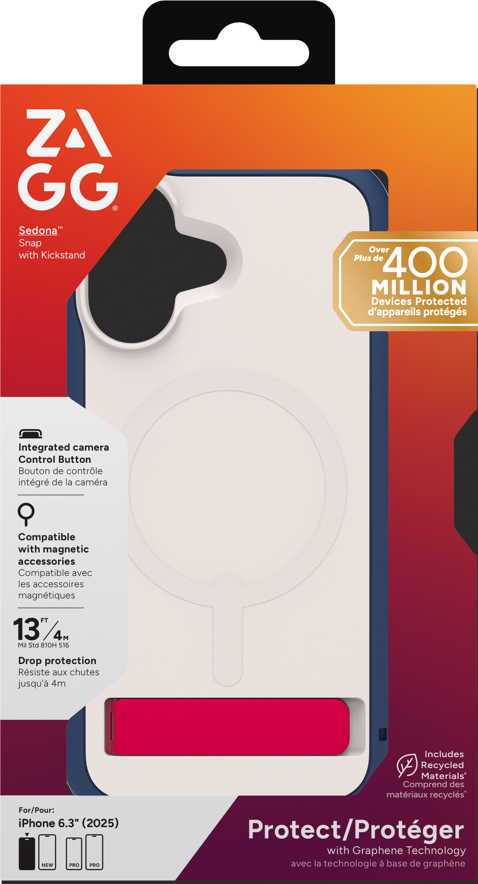 ZAGG Sedona Snap Kickstand. Type d'étui: Housse, Compatibilité de marque: Apple, Compatibilité: iPhone 17, Taille maximale de l’écran: 16 cm (6.3"), Couleur du produit: Bleu, Rouge, Blanc, Support de bureau