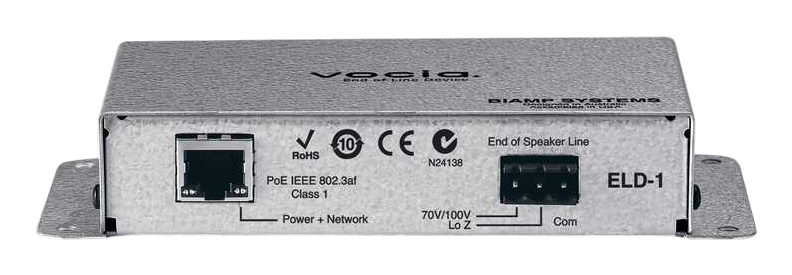 Biamp Vocia ELD-1, IEEE 802.3af, Avec fil, CE marked (Europe) RoHS Directive (Europe) RINA (Italy), 0 - 45 °C, 0 - 95%, 300 g