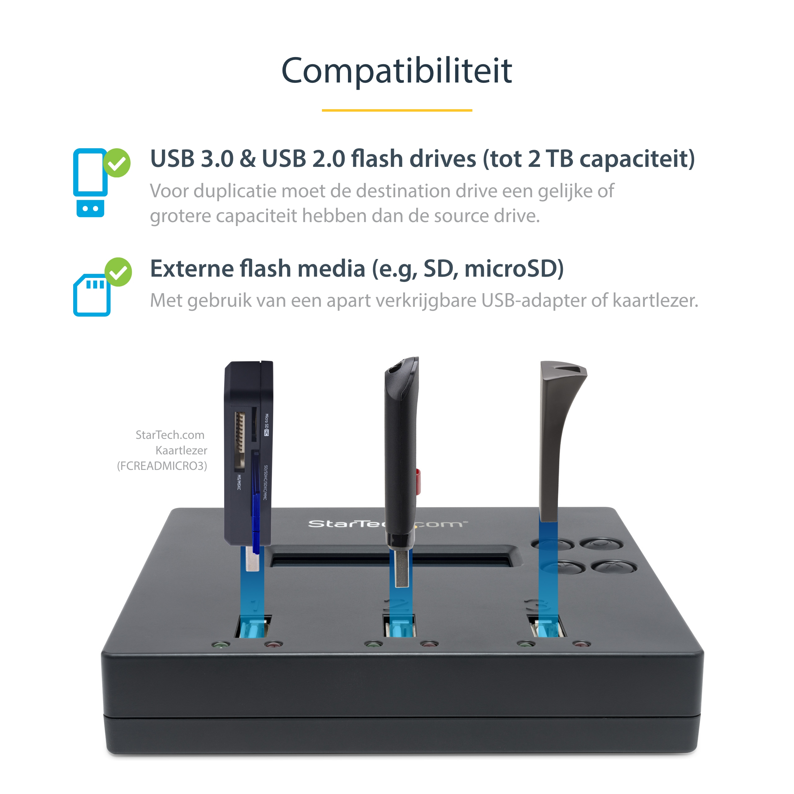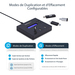 Le duplicateur USB vous permet de copier jusqu'à deux lecteurs simultanément (duplication synchrone) avec des vitesses allant jusqu'à 1,5 Go par minute. Il offre également une duplication asynchrone, vous permettant de retirer et de remplacer un lecteur pendant que l'autre continue à être copié.