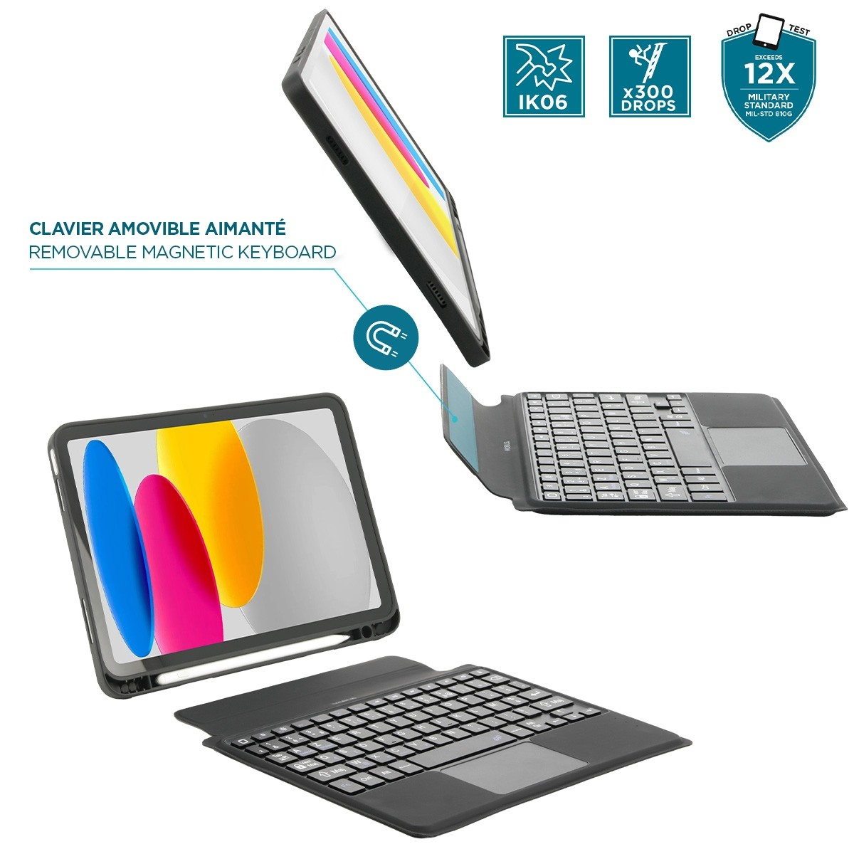 Coque de protection pour iPad 10.9'' avec clavier Bluetooth français détachable + touchpad, noir