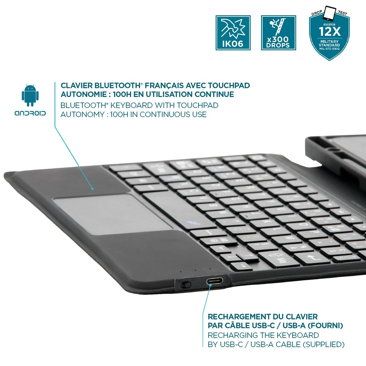 Le clavier Bluetooth® est très facile à utiliser et à appareiller à votre iPad 10.9'' (touches Fn + Connect en simultané pour activer l’appairage). Il offre jusqu’à 100h d’autonomie en usage continu et se charge par un câble USB-C/ USB-A four