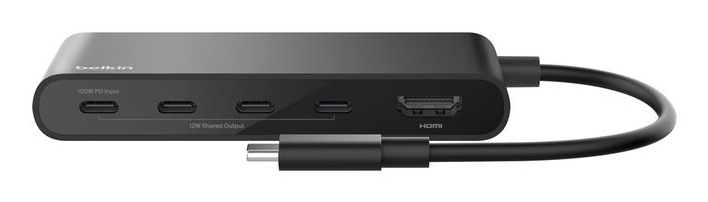 Belkin AVC021HQBK. Interface de l'hôte: USB Type-C, Interfaces Hub: HDMI, USB Type-C, USB 3.2 Gen 2 (3.1 Gen 2) Type-C. Taux de transfert de données: 10000 Mbit/s, Couleur du produit: Noir, Délivrance de la puissance USB jusqu’à: 100 W. Prise en charge d'autres systèmes d'exploitation: iOS, iPadOS, ChromeOS. Largeur: 104 mm, Profondeur: 50 mm, Hauteur: 15 mm. Quantité: 1 pièce(s)