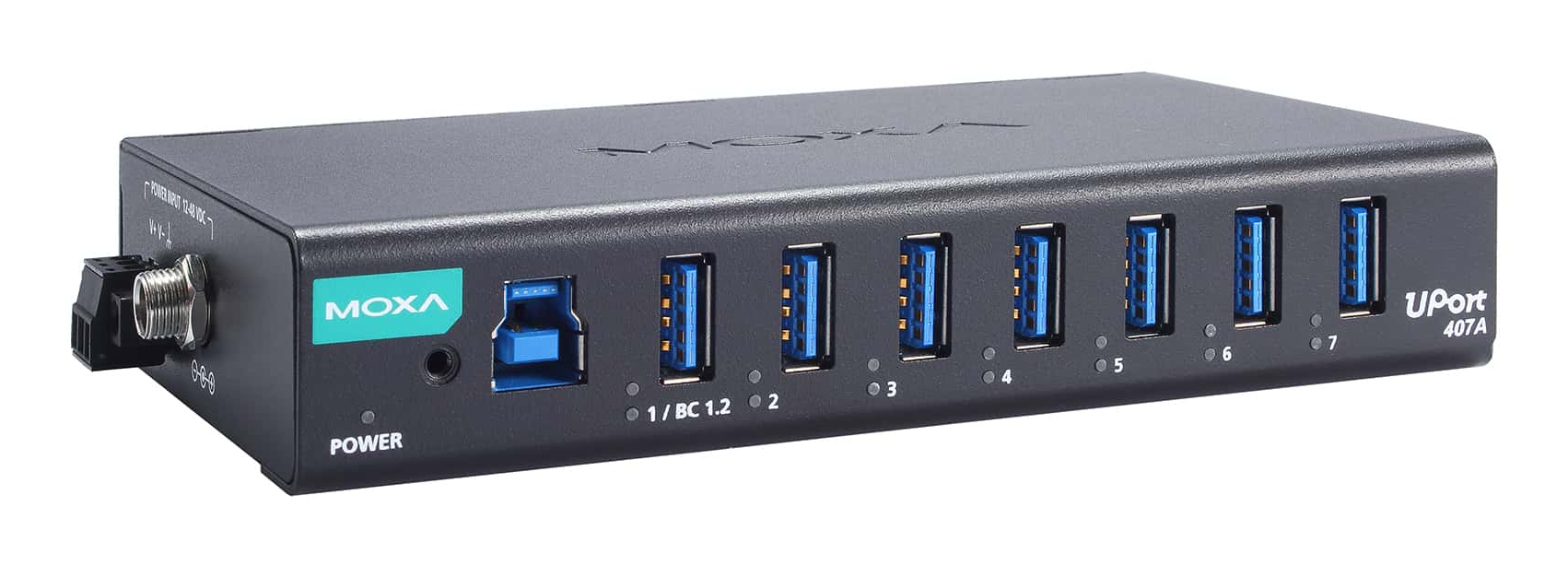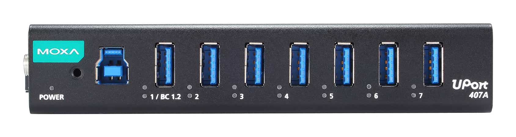 Moxa UPORT 407A. Interface de l'hôte: USB 2.0 Type-B, Interfaces Hub: USB 3.2 Gen 1 (3.1 Gen 1) Type-A. Taux de transfert de données: 5000 Mbit/s, Couleur du produit: Noir, Matériau du boîtier/corps: Métal. Type d'alimentation d'énergie: CC, Tension d'entrée: 12 - 48 V, Courant d'entrée: 4.75 A. Largeur: 140 mm, Profondeur: 80 mm, Hauteur: 27 mm. Quantité: 1 pièce(s)