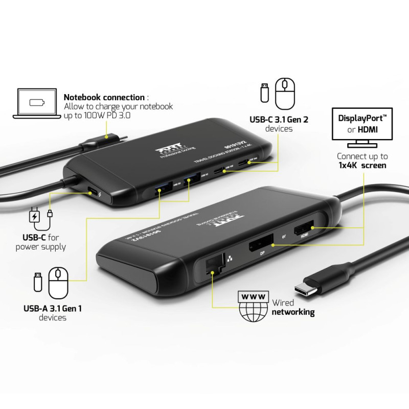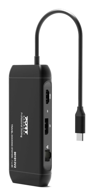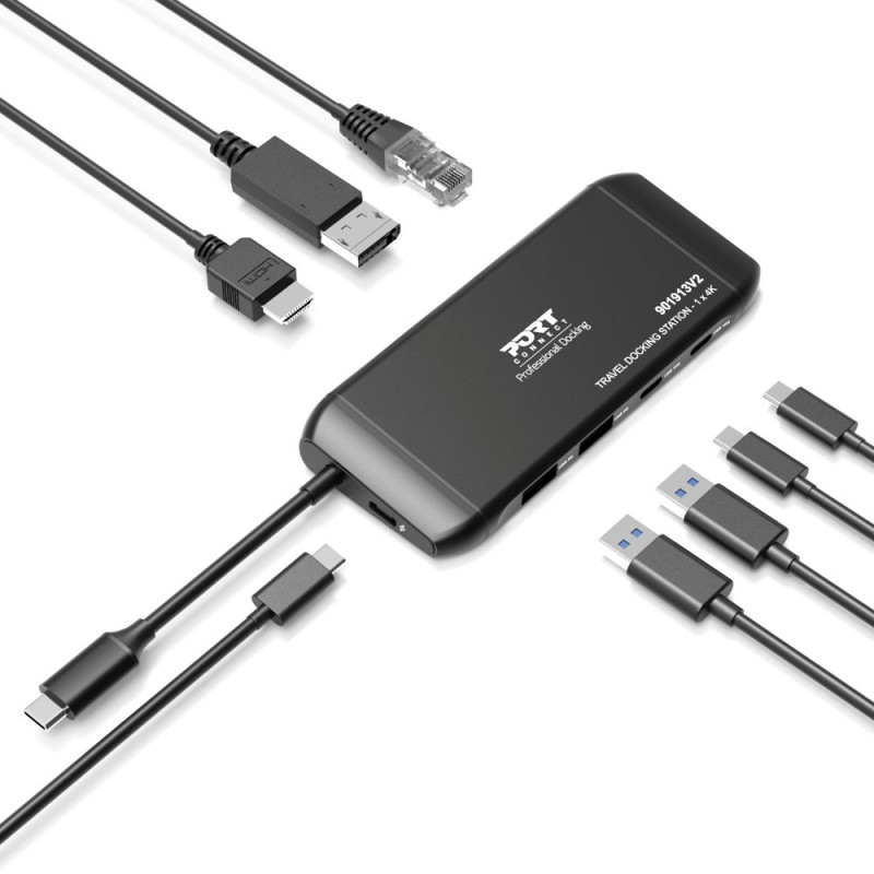 Port Designs PORT Connect Station d'accueil mobile 1 X 4K USB-C 7 périphériques 100W, USB Type-C, USB 3.2 Gen 2 (3.1 Gen 2) Type-C, USB 3.2 Gen 1 (3.1 Gen 1) Type-A, HDMI, DisplayPort, RJ-45, 10000 Mbit/s, 3840 x 2160, 2160p, Noir