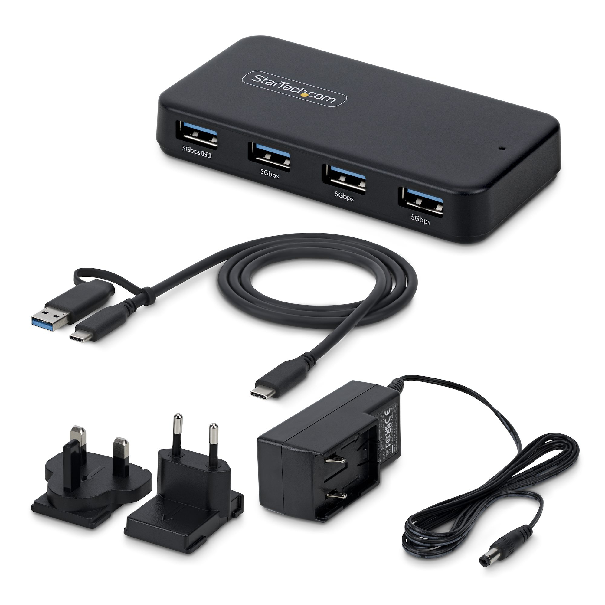 StarTech.com Hub USB-A à 4 Ports, 5 Gbps, Auto-Alimenté, Câble Hôte USB-C et USB-A 2 en 1, 1 Port de Chargement BC 1.2, Adaptateur Secteur 24W Inclus, MacBook et Windows, USB 3.2 Gen 1 (3.1 Gen 1) Type-C, USB 3.2 Gen 1 (3.1 Gen 1) Type-A, 5000 Mbit/s, Noi