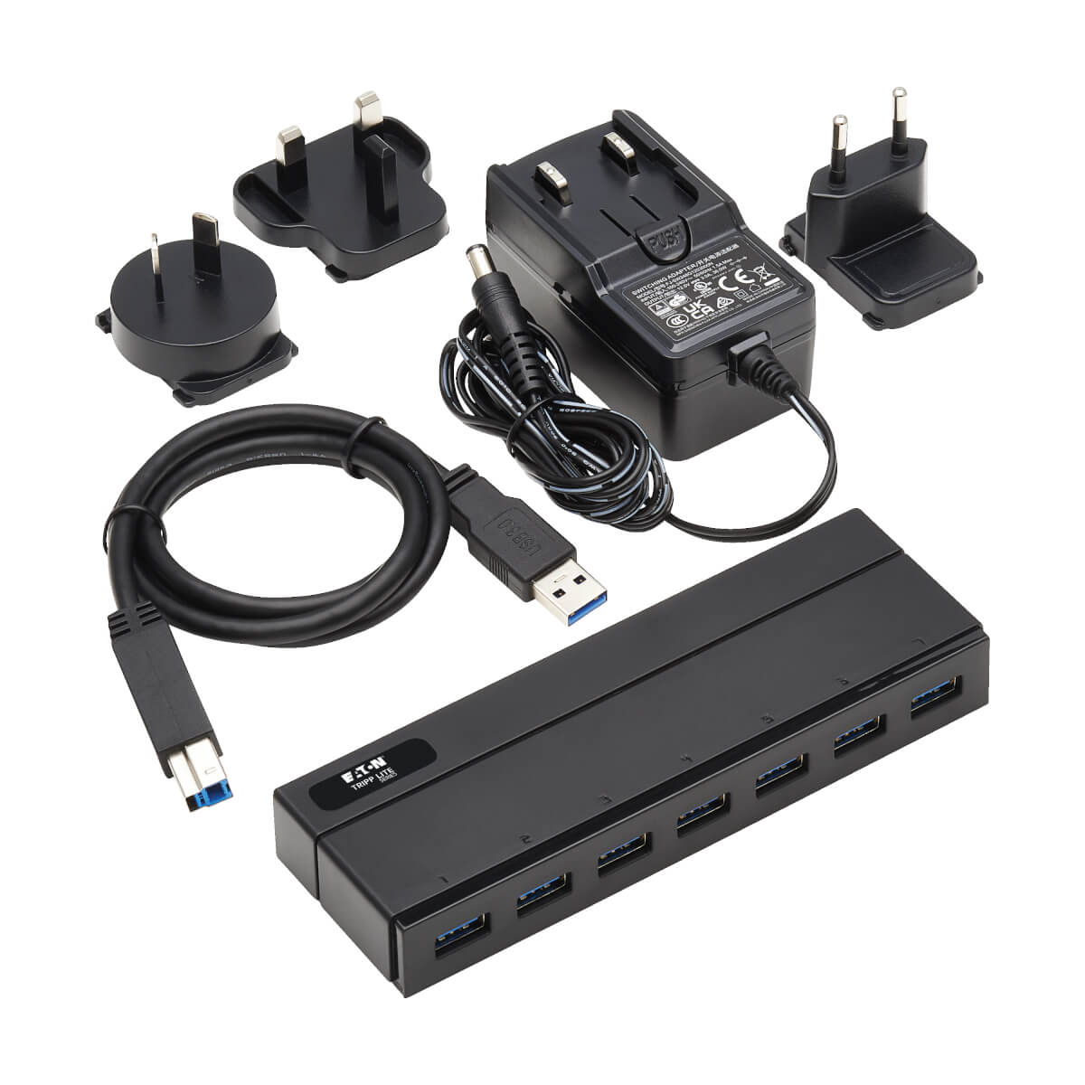 Tripp Lite U360-007-INT. Interface de l'hôte: USB 3.2 Gen 1 (3.1 Gen 1) Mini-B, Interfaces Hub: USB 3.2 Gen 1 (3.1 Gen 1) Type-A. Taux de transfert de données: 5000 Mbit/s, Couleur du produit: Noir, Matériau du boîtier/corps: Acrylonitrile-Butadiène-Styrène (ABS). Type d'alimentation d'énergie: Secteur, Tension d'entrée: 100 - 240 V, Courant d'entrée: 1.5 A. Quantité: 1 pièce(s), Largeur du colis: 96,5 mm, Profondeur du colis: 180,3 mm. Types de fiches d'alimentation fournies: AU, EU, UK, Câbles inclus: USB Type-A vers USB Type-B