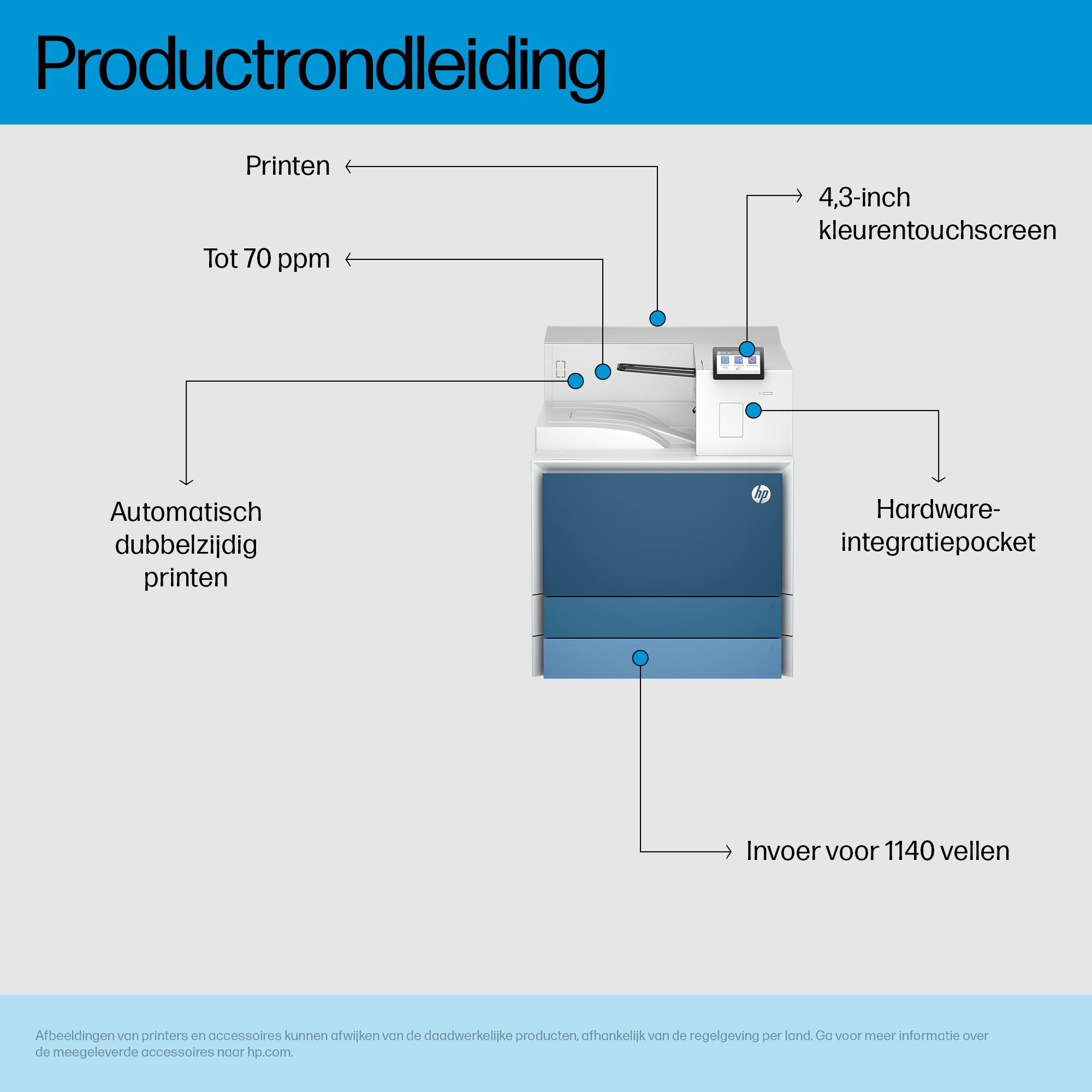 HP LaserJet Enterprise 8501DN Printer Europe - Multilingual Localization, Laser, 1200 x 1200 DPI, A3, 70 ppm, Impression recto-verso, Bleu, Blanc
