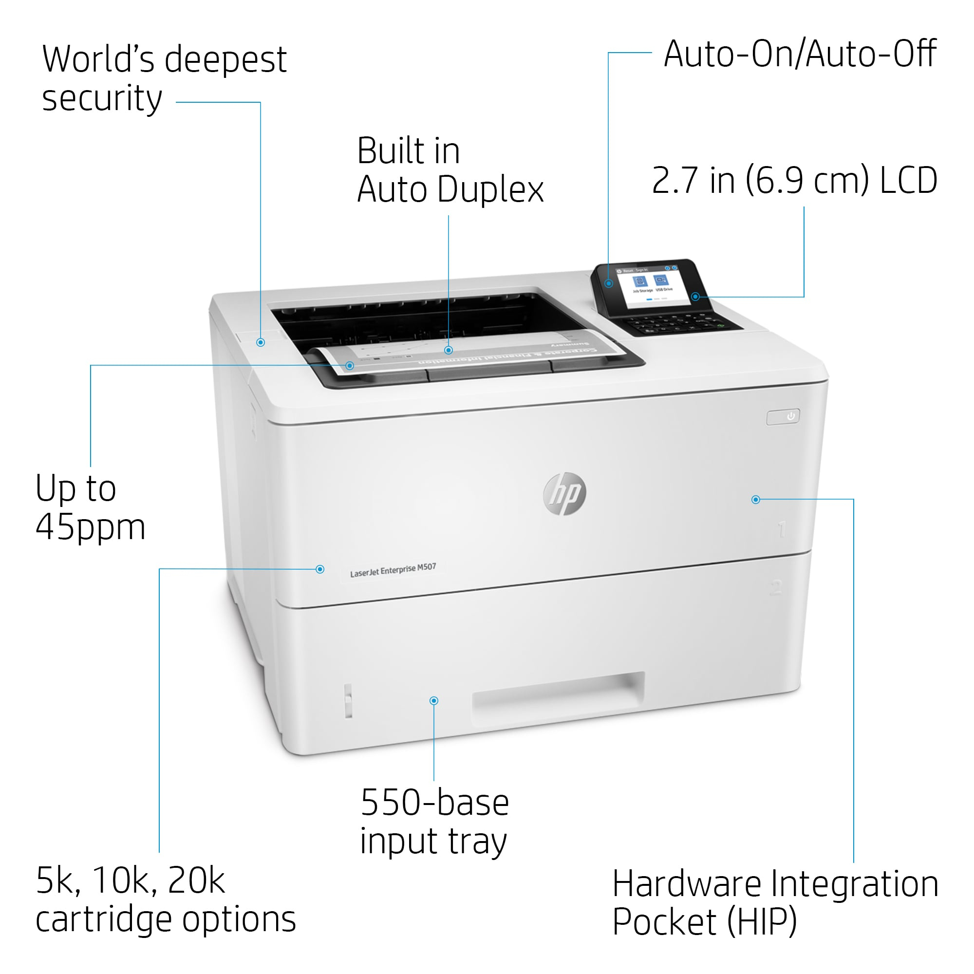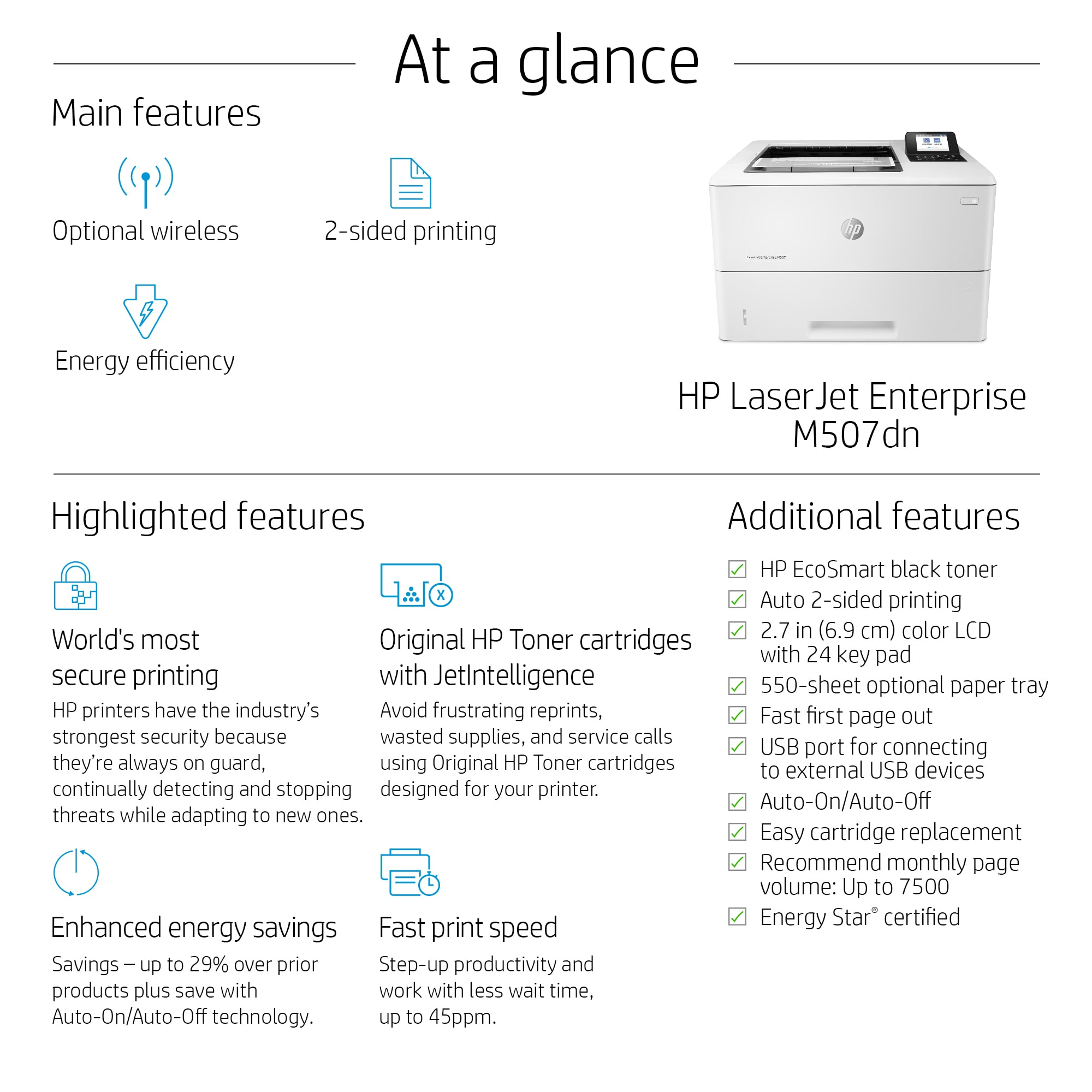 HP LaserJet Enterprise M507dn Noir et blanc Imprimante, Ethernet uniquement; Recto verso, Laser, 1200 x 1200 DPI, A4, 43 ppm, Impression recto-verso, Réseau prêt à l'usage