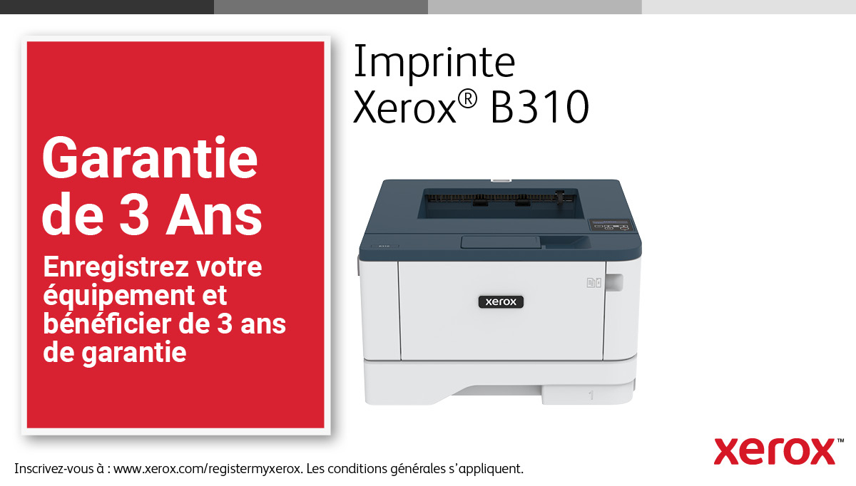 L’imprimante Xerox® B310 est une imprimante noir et blanc compacte, idéale pour les équipes de production et les bureaux à domicile. Facile à configurer avec le logiciel Xerox® Smart Start et prête à travailler directement dès que vous la déballez. L’imprimante B310 inclut des fonctionnalités sans fil intégrées avec Wi-Fi Direct et une interface facile à utiliser. Conçue pour les petites et moyennes entreprises et les bureaux à domicile dotés de fonctions telles que l’impression recto verso automatique sur papier format Letter et Legal, la capacité papier standard de 250 feuilles, un processeur double cœur de 1 GHz avec 256 Mo de mémoire et des volumes d’impression mensuels jusqu’à 8 000 pages, l’imprimante B310 est un appareil fiable. Avec sa certification EPEAT, le produit respecte tous les critères en matière de conception, production, rendement énergétique et recyclage. Notre programme de recyclage des consommables Xerox vous permet de recycler les cartouches de toner sans tracas.