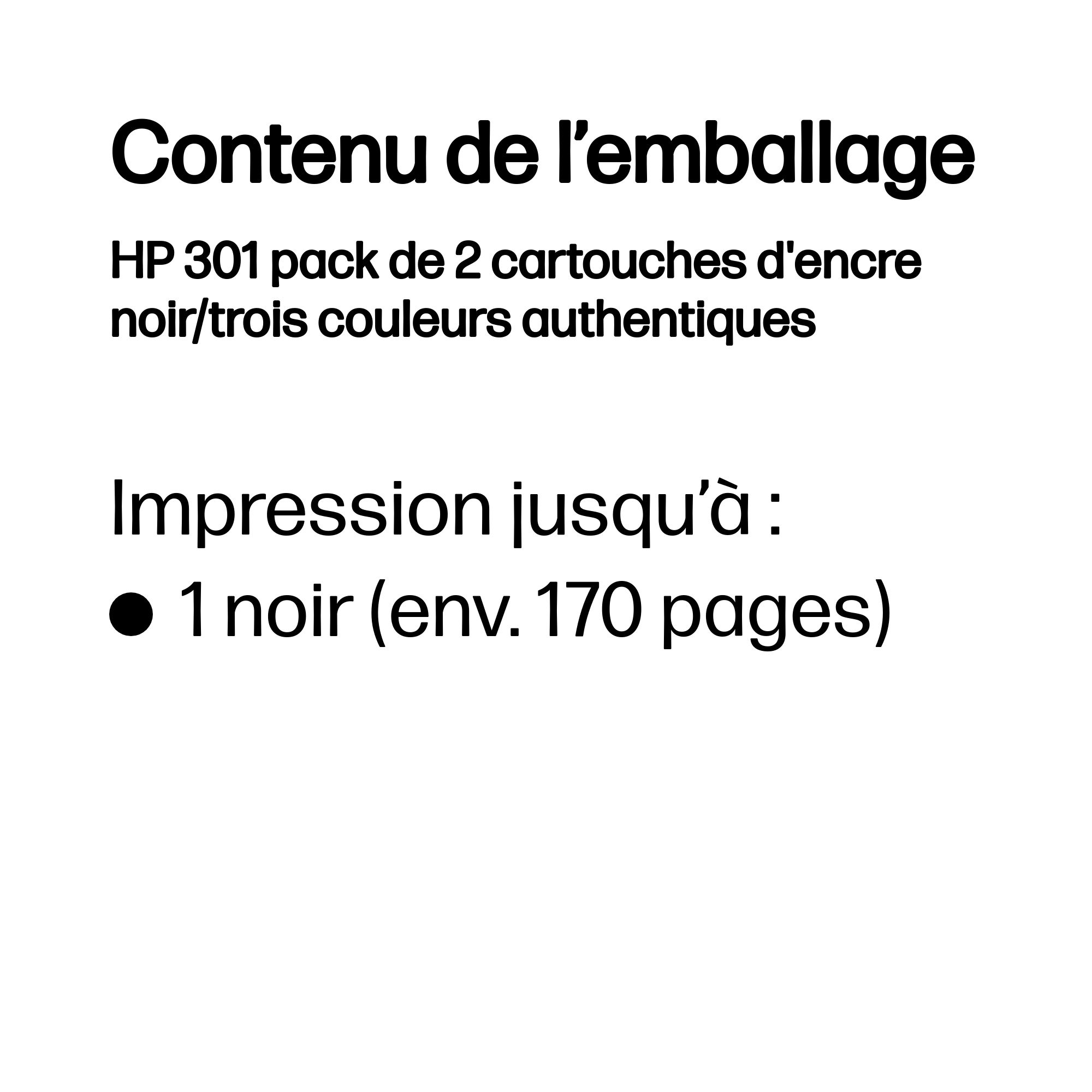 HP 301 pack de 2 cartouches d'encre noir/trois couleurs authentiques, Rendement standard, Noir, Cyan, Magenta, Jaune, Encre à pigments, Encre à colorant, 3 ml, 3 ml