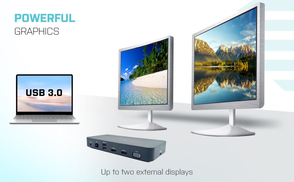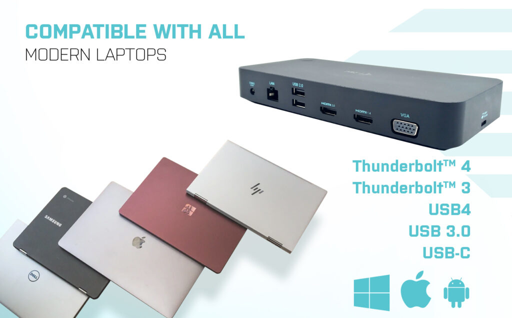 Une station d’accueil professionnelle puissante qui prend en charge la sortie vers jusqu’à trois moniteurs externes. La station d’accueil peut être utilisée avec pratiquement tous les ordinateurs portables, car elle prend en charge la connexion à tous les ports courants : USB 3.0, USB-C, USB4 et Thunderbolt » 3/4, tout en prenant en charge tous les systèmes d’exploitation courants. Toutefois, la connexion à trois moniteurs ne sera possible qu’avec un ordinateur portable doté d’un port Thunderbolt 3/4 ou d’un port USB-C prenant en charge le transfert vidéo (mode USB-C DP Alt).