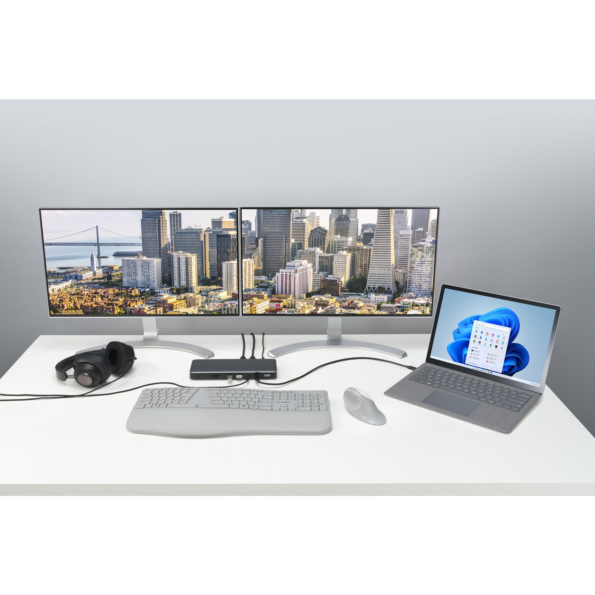 Idéale pour les professionnels actifs travaillant à domicile ou au bureau et compatible avec les derniers MacBook, Surface et autres ordinateurs portables équipés de ports Thunderbolt™ 4, la station d’accueil SD5760T vous offre tout ce dont vous avez besoin pour améliorer votre productivité aujourd’hui et à l’avenir. Compatible avec les appareils équipés de ports Thunderbolt 4, Thunderbolt 3, USB4 et USB-C sous Windows ou macOS, la SD5760T vous offre une véritable expérience Plug & Play, sans aucun pilote ni téléchargement nécessaire. Elle offre un grand choix de ports vidéo, notamment une sortie vidéo 8K à 60 Hz (via un port TB4 à l’avant) ou deux sorties vidéo 4K à 60 Hz (via deux ports HDMI ou un port TB4). Visant à améliorer la productivité, la SD5760T offre une alimentation jusqu’à 96 W, une vitesse de transfert de données jusqu’à 40 Gbits/s, une connexion en série et 13 ports. Inclut le logiciel Kensington DockWorks™ et une garantie limitée de 3 ans.