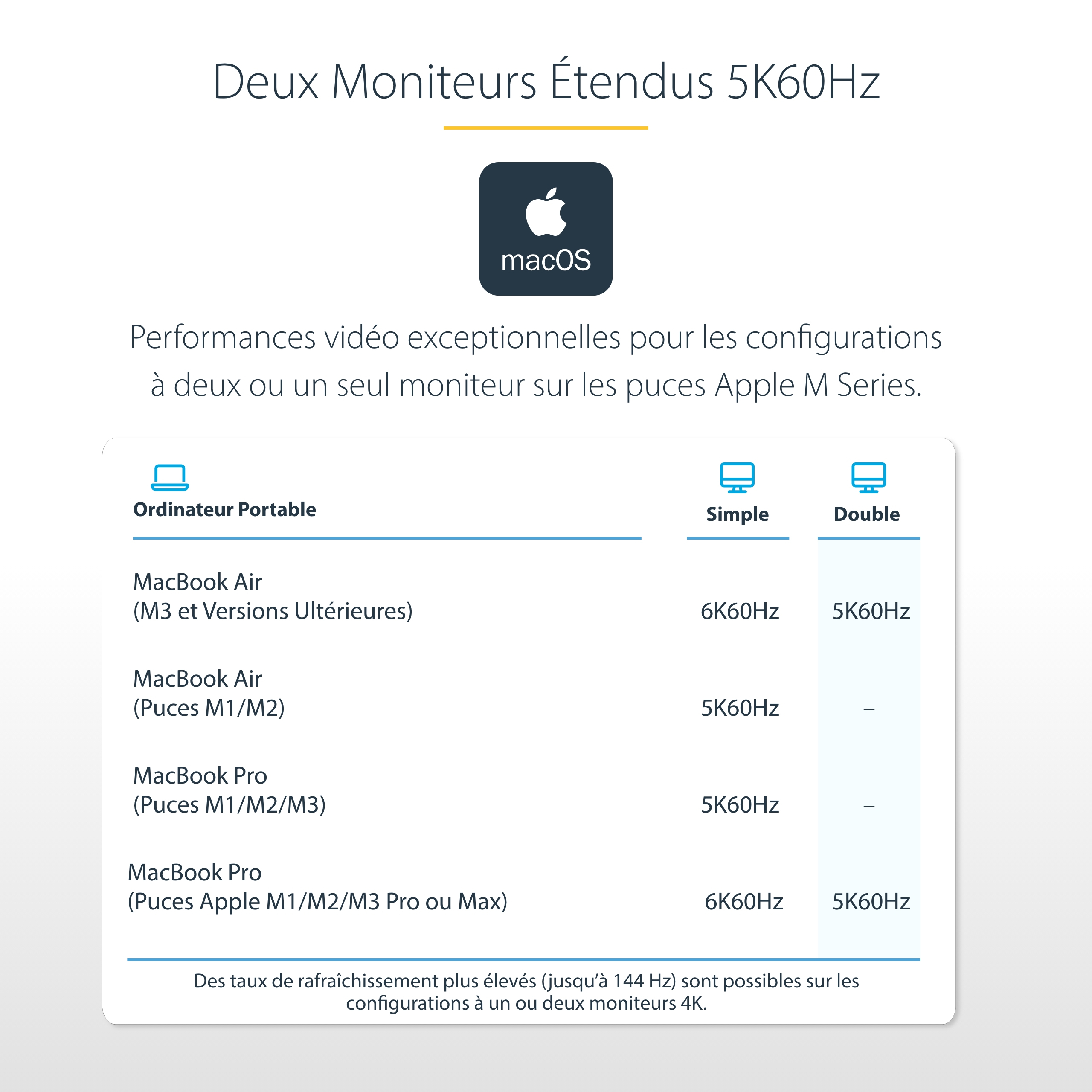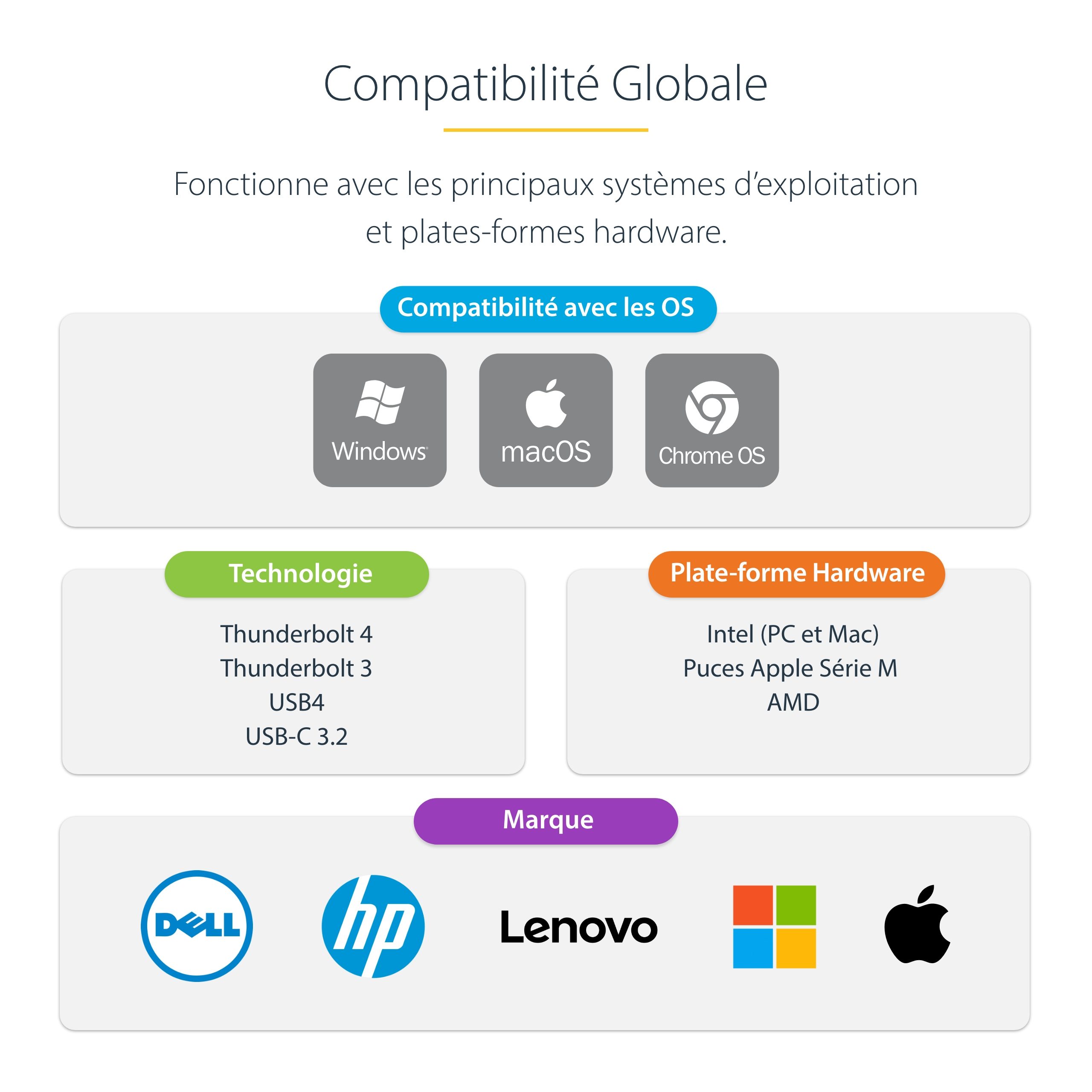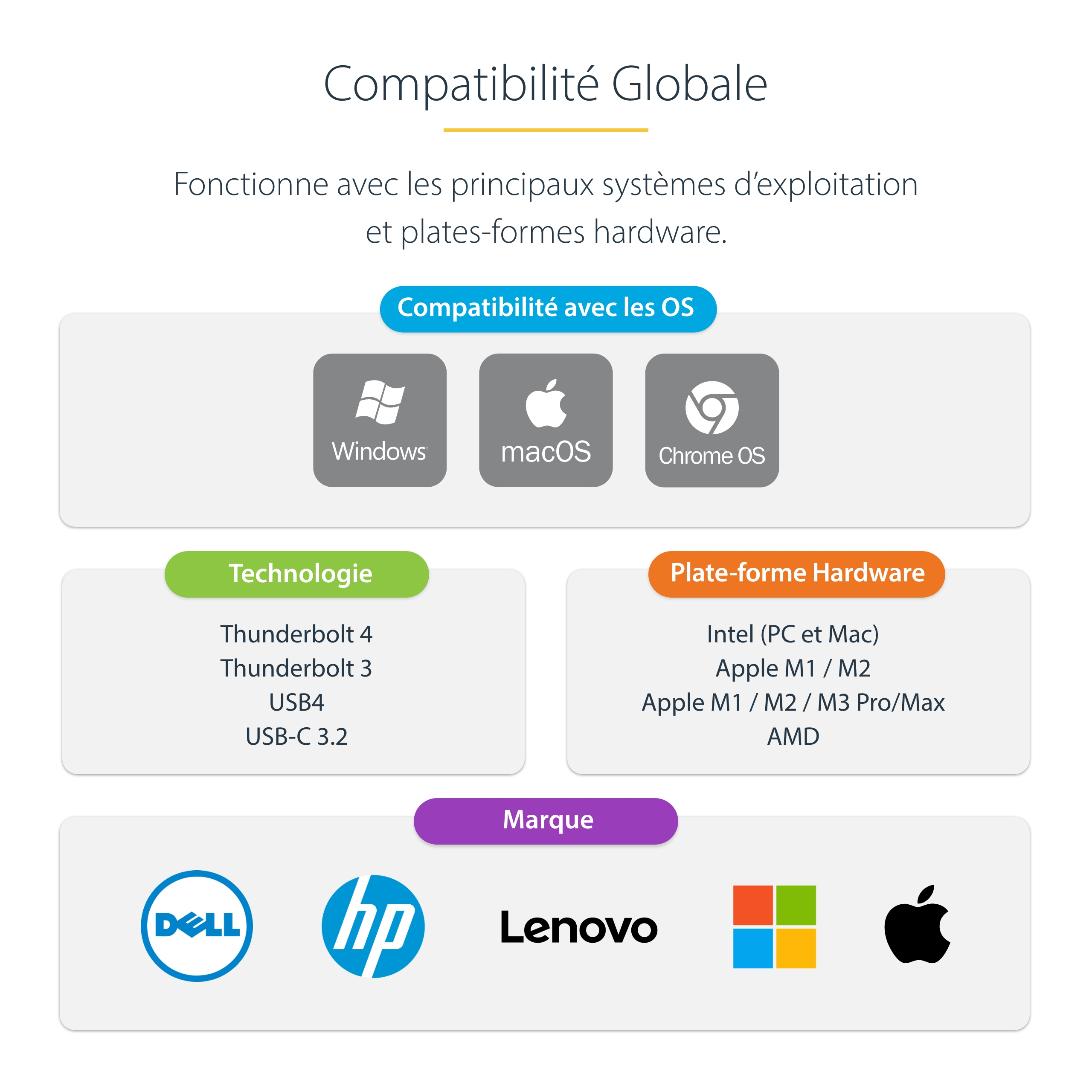 La station d'accueil utilise le débit élevé de 40 Gbps disponible sur le port Thunderbolt 4, Thunderbolt 3 ou USB4 de votre ordinateur pour fournir une large gamme de connectivité de port afin de répondre à une variété d'applications.