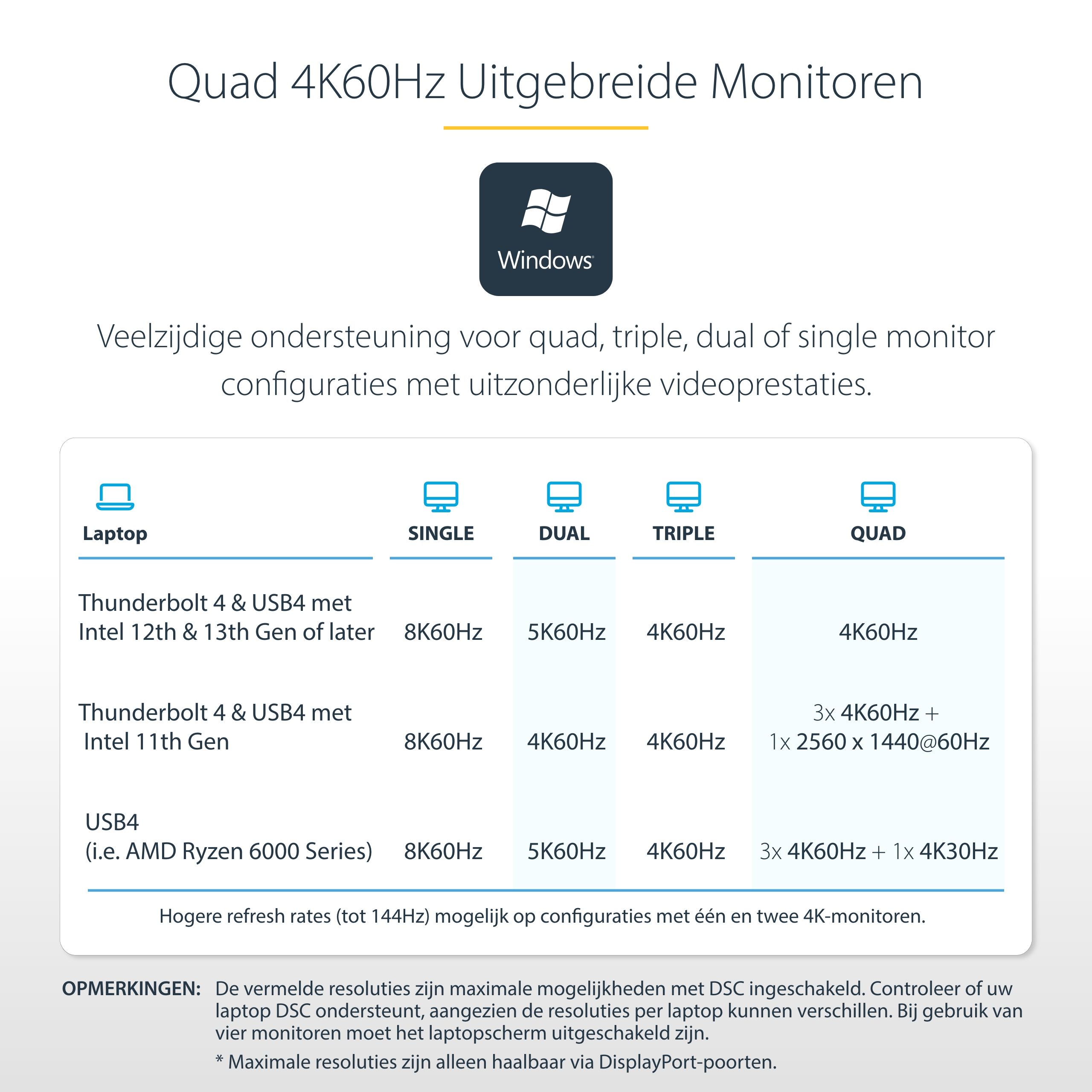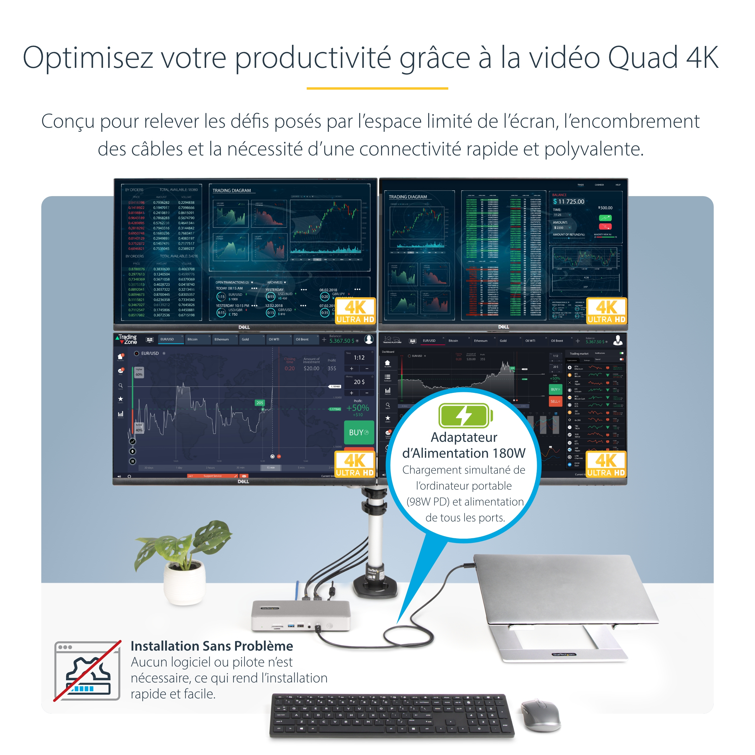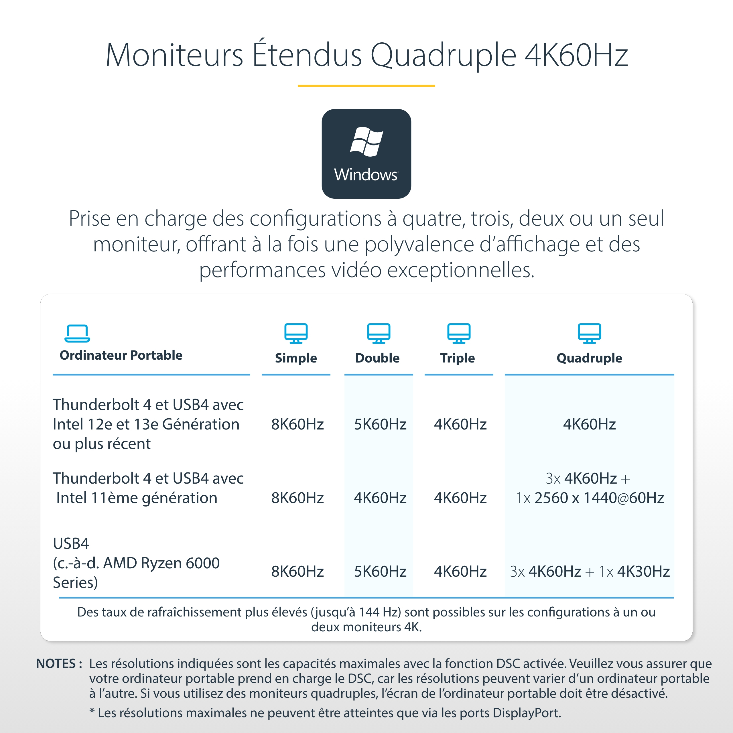 La station d'accueil est équipée de 2 ports HDMI et 2 sorties vidéo DisplayPort pour connecter plusieurs moniteurs à l'ordinateur hôte. La station offre une flexibilité vidéo, prenant en charge des configurations de moniteur unique, double, triple ou quadruple. Avec un processeur Intel de 12e génération ou supérieur prenant en charge DP 1.4 avec DSC, la station d'accueil peut prendre en charge une configuration de quatre moniteurs avec des résolutions allant jusqu'à 4K à 60 Hz. Des configurations de quatre écrans sont également disponibles à des résolutions ou des taux de rafraîchissement inférieurs sur les ordinateurs sans DSC ou avec des révisions Intel antérieures. De plus, la station d'accueil prend en charge un affichage unique 8K à 60 Hz sur l'un des ports de sortie HDMI.