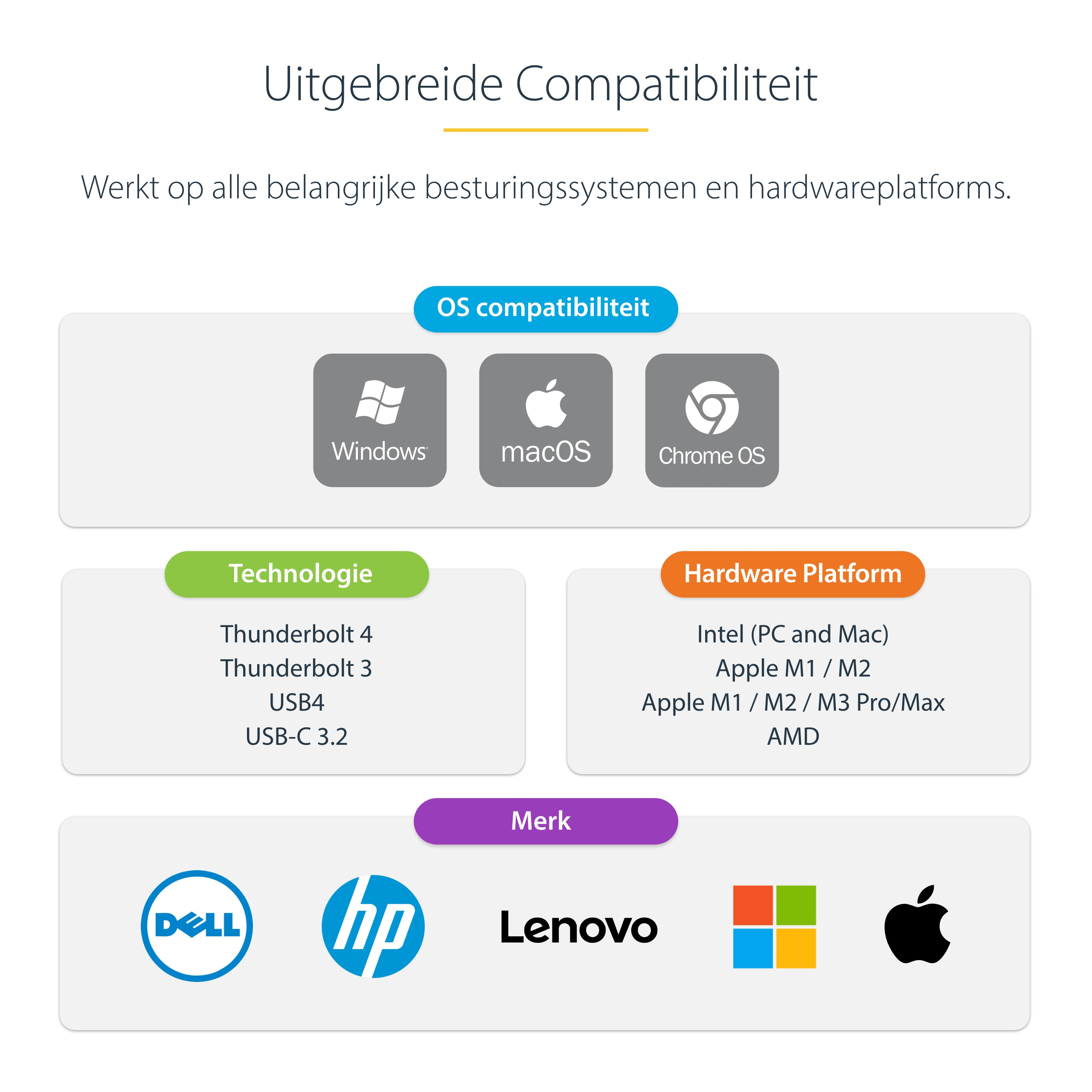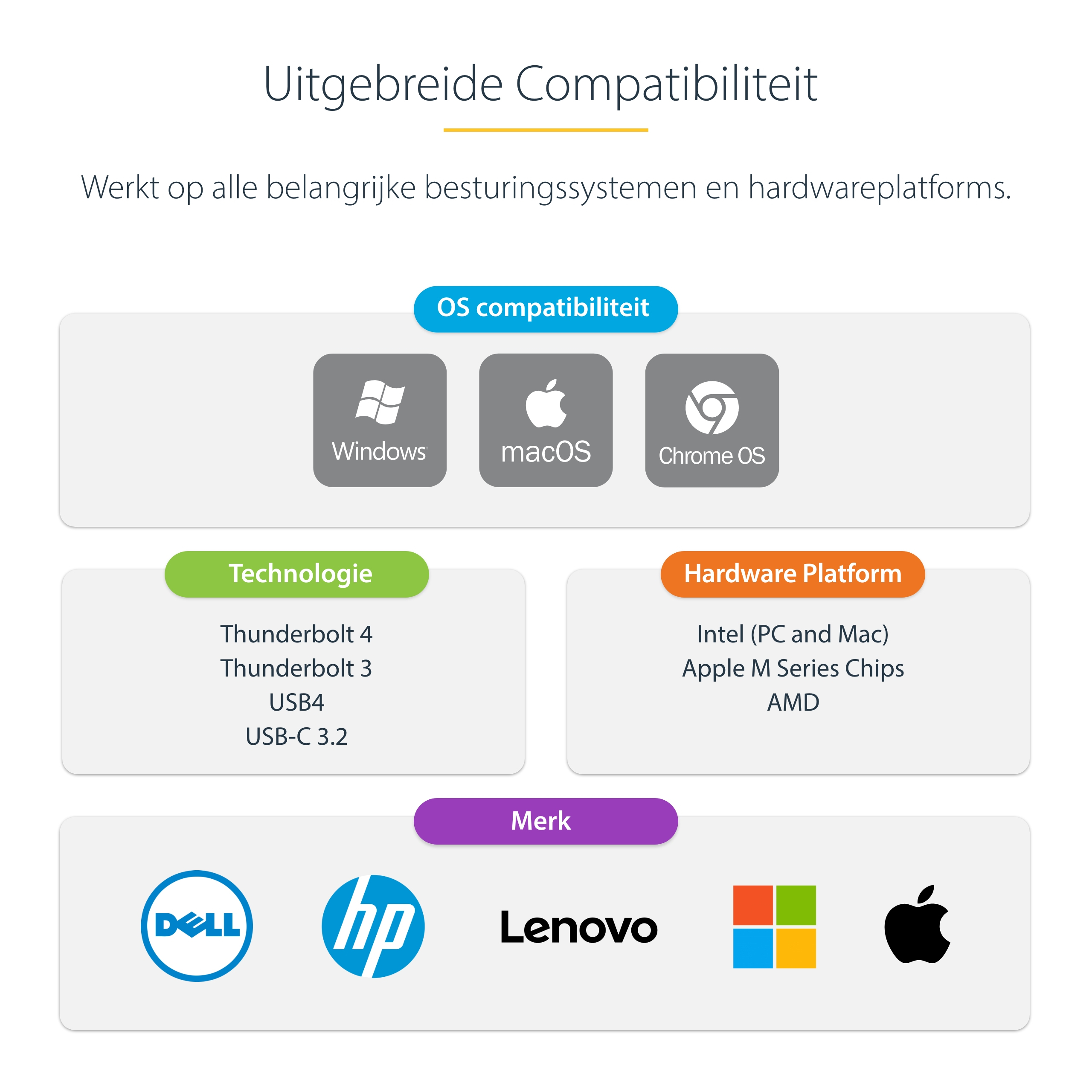 Cette station d'accueil certifiée Thunderbolt 4 utilise un seul port Thunderbolt 3, Thunderbolt 4, USB4 ou USB Type-C sur un ordinateur hôte pour ajouter une connectivité haute performance tout en chargeant l'ordinateur portable. Pour un déploiement rapide, la station d'accueil inclut un câble Thunderbolt 4 de 3,3 pieds (1 mètre) qui se connecte au port hôte USB-C orienté vers l'avant et dispose de deux emplacements de sécurité de style Kensington de différentes tailles.