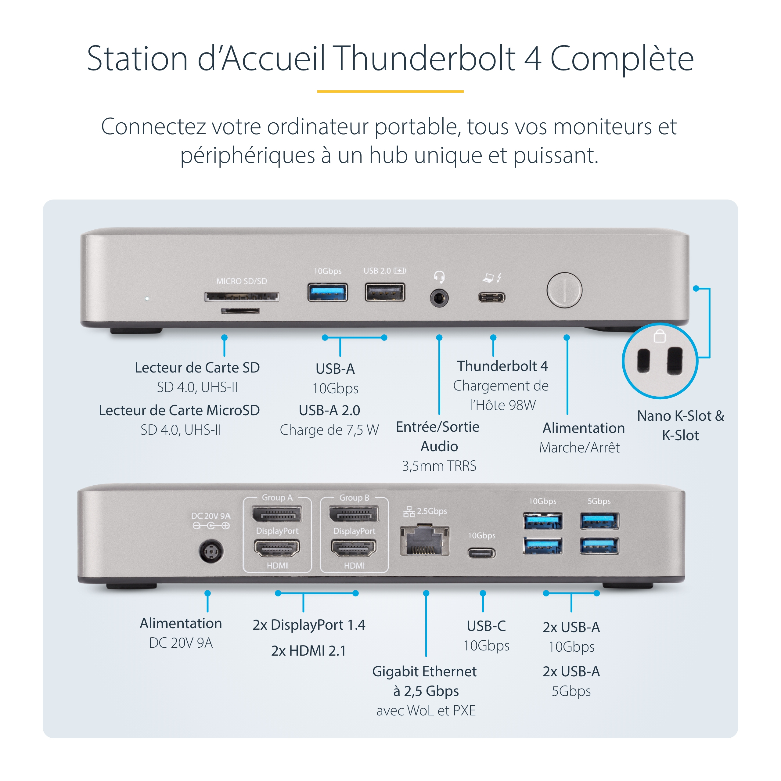 StarTech.com Station d'Accueil Universelle USB4 et Thunderbolt 4, Quatre Écrans sous Windows, Deux Écrans sur MacBook, Station d'Accueil HDMI DP avec Chargeur pour PC Portable 100W, Avec fil, Thunderbolt 4, 98 W, 3,5 mm, 10,100,1000,2500 Mbit/s, 2.5GBASE-