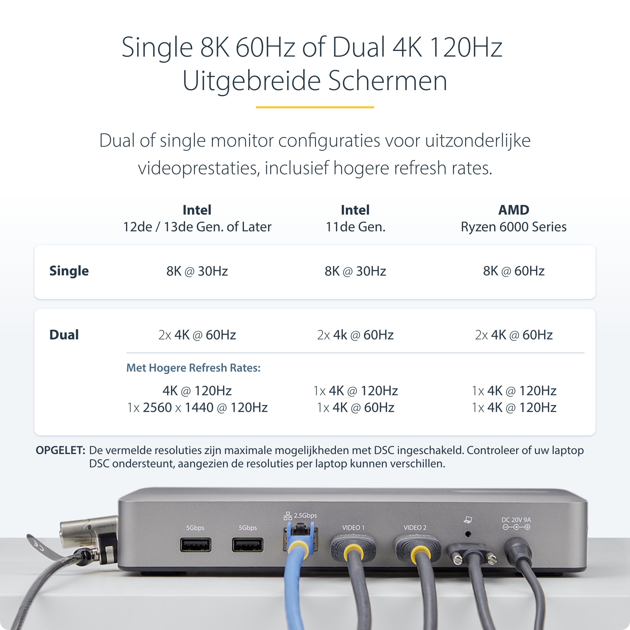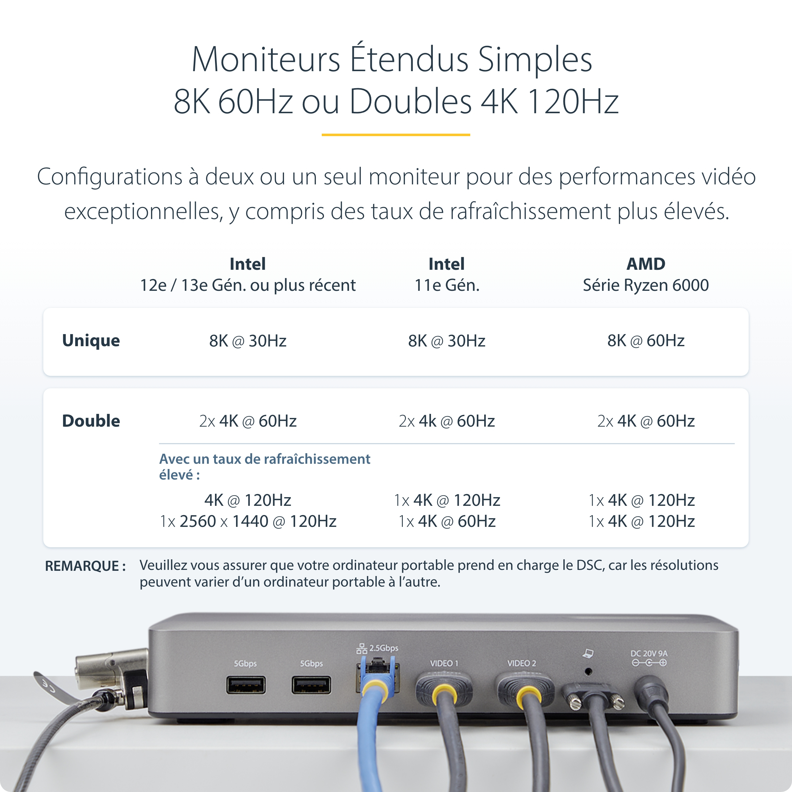 La station d'accueil est équipée de 2 sorties vidéo HDMI 2.1 pour connecter deux moniteurs à l'ordinateur hôte. La station d'accueil peut prendre en charge deux moniteurs avec des résolutions allant jusqu'à deux 4K 60Hz à 4:4:4 (RGB) ou deux 4K 120Hz à 4:2:2. Une station de travail à un seul écran est également prise en charge avec des résolutions allant jusqu'à 8K 30Hz 4:4:4 (RGB) ou 8K 60Hz à 4:2:2.