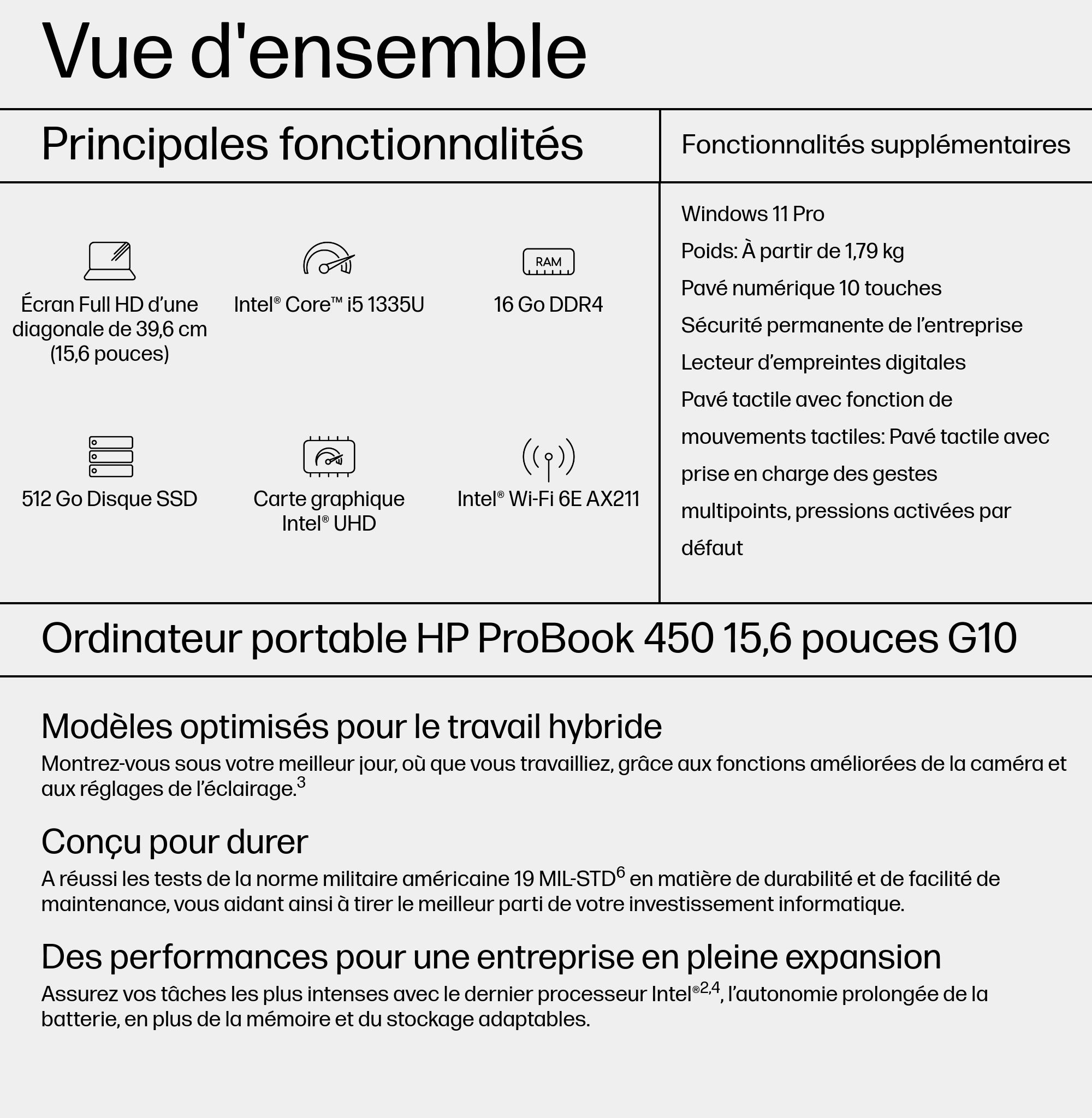 Ordinateur portable HP ProBook 450 15,6 pouces G10, 15.6", Windows 11 Professionnel, Intel® Core™ i5, 16Go RAM, 512Go Disque SSD, FHD